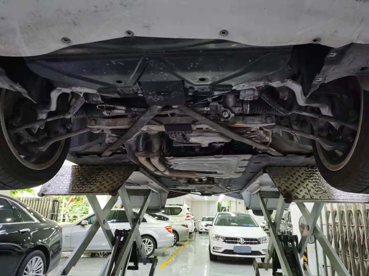 将车辆举起来检测底盘,拆掉护板后有点儿欣喜,没有预想的那种漏油成河的现象,底盘干干爽爽的,难道这是个假的宝马?德国血统不纯啊!