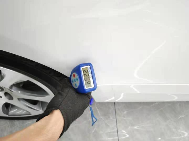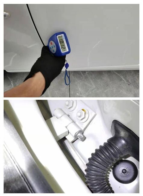 左前门局部钣金喷漆,漆面厚度达到了1012μm,剐蹭的有点儿厉害!拉开车门查看固定螺丝还是原厂状态,门框结构也没有损伤修复。