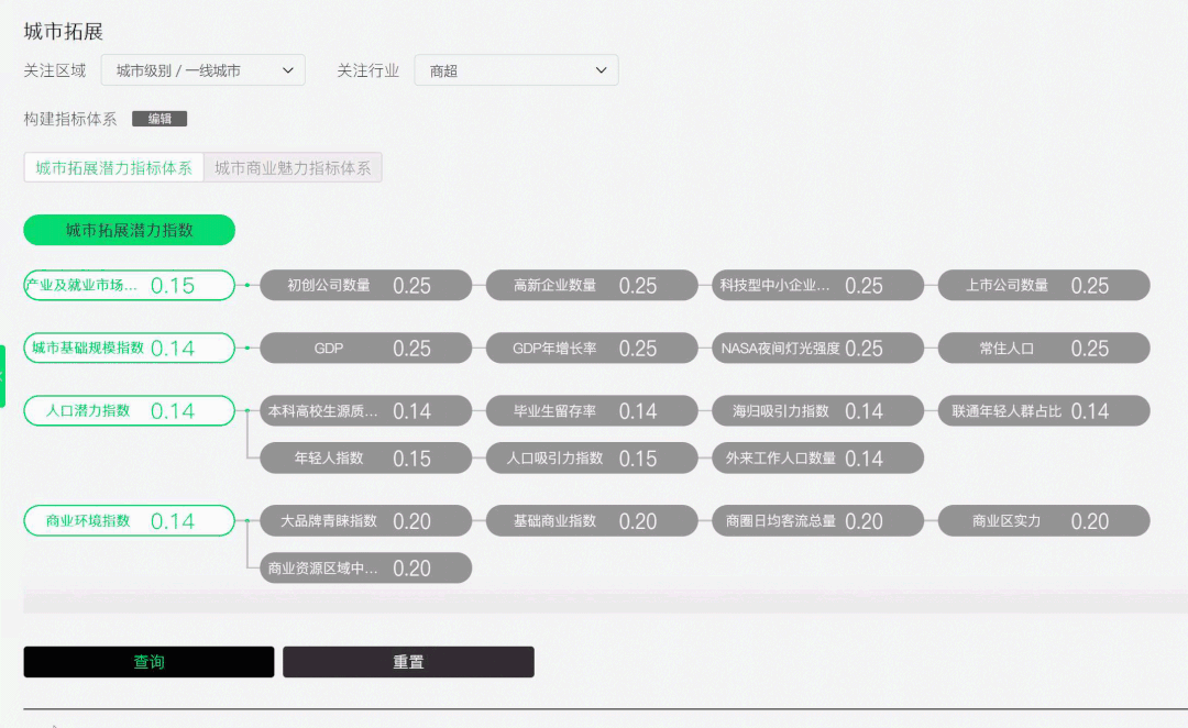 Δ 支持自定义构建城市拓展潜力体系和城市商业魅力指标体系