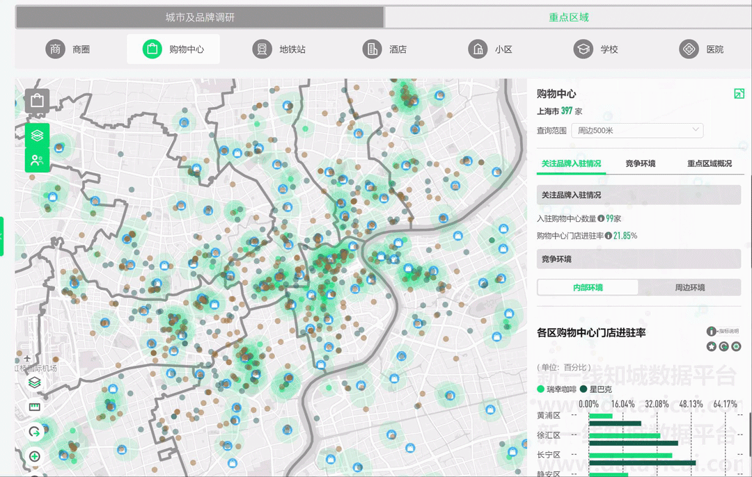 选址研究则是一个更具功能性的板块。我们选取城市商业的重点区域——购物中心、商圈、地铁站、小区、学校等等,查看它们在地图上的分布状态。用户通过选择想要了解的重点区域,如购物中心,就能看到重点区域内或周边的品牌入驻情况、竞争环境以及购物中心在全市各地块的数量等情况。