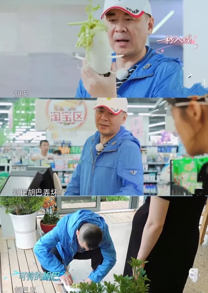 两人去超市,买了一个带叶子的白萝卜,陈建斌管它叫胡巴,放购物车里怕压着了,蒋勤勤在旁边乐不可支,管他叫陈三岁。