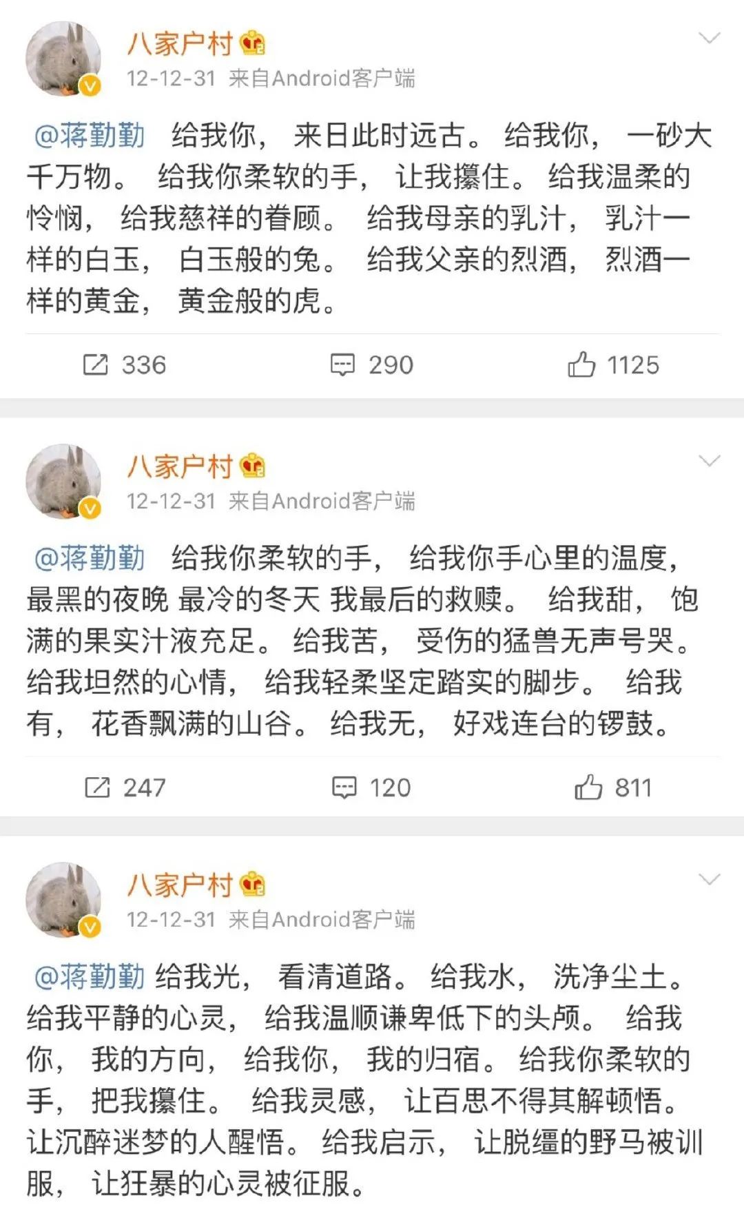 蒋勤勤在微博上,也转发过陈建斌写给自己的情诗。那些诗,有一种老派的激情四溢。