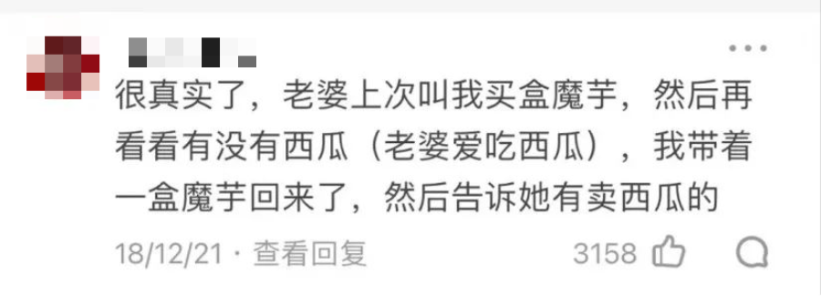 很真实了,老婆上次叫我买盒魔芋,然后再看看有没有西瓜,我带着一盒魔芋回来,告诉我老婆有卖西瓜的……