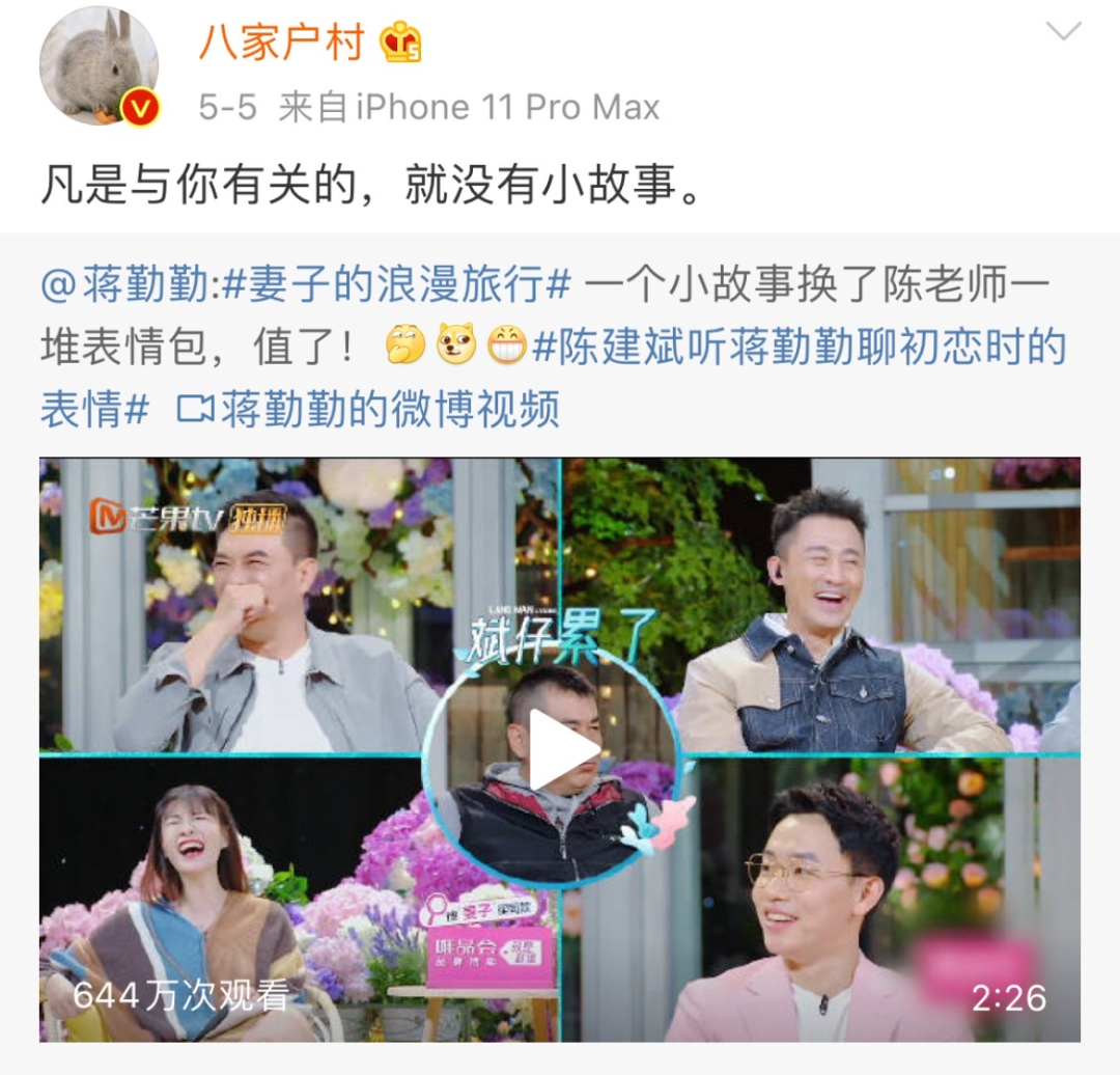 最近,蒋勤勤在微博上宣传节目,说一个小故事换了陈老师一堆表情包,陈建斌转发回复:凡是与你有关的,就没有小故事。