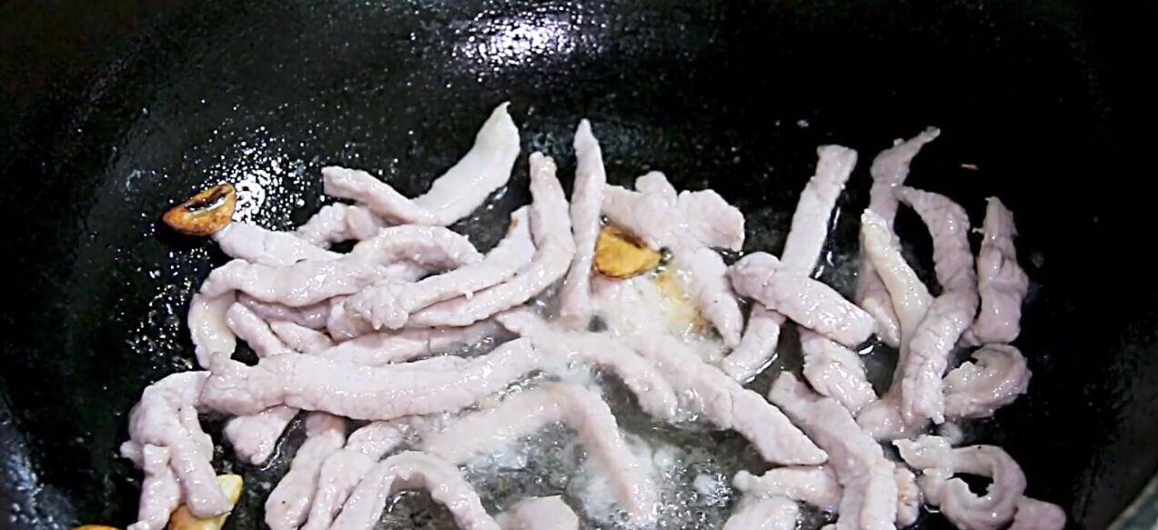 2、起锅,锅中倒入适量食用油,油热后下入切好的肉丝,然后快速划散,开中大火不断翻炒,炒出肉丝中的水分,待肉丝炒至表面略微焦黄的时候,盛出装入盘中备用;