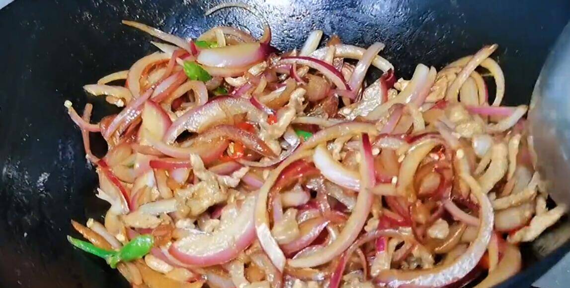 4、大火继续翻炒,炒至洋葱断生后就可以关火出锅了,盛入盘中,这道非常简单的家庭版洋葱炒肉就做好了,步骤非常简单,肉丝吃起来干香细嫩,特别好吃入味,小孩子特别爱吃。
