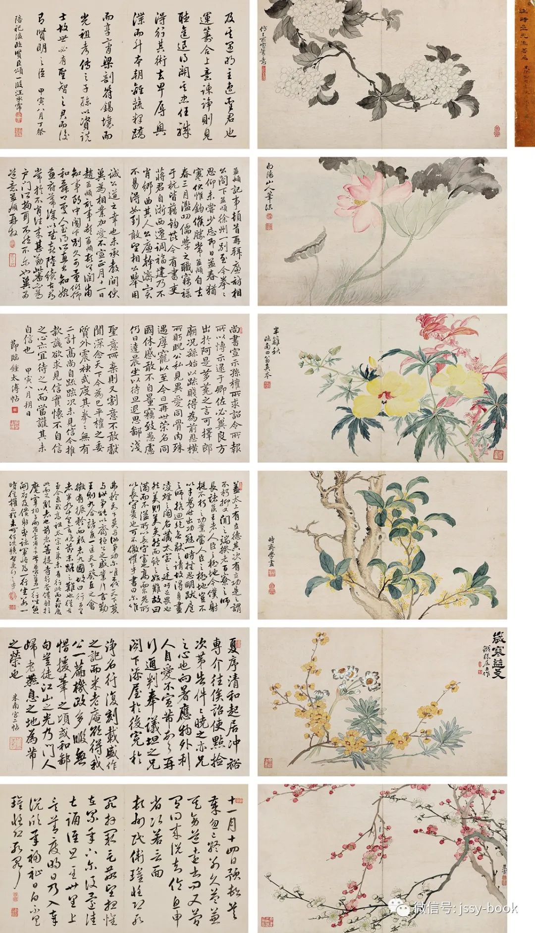 历史上子承父业者,明代有文氏(文徵明)父子;清代中也有像张英、张廷济父子,董邦达、董诰父子等。而汪由敦与汪承霈父子也在其中之列。汪承霈(?-1805)。字受时,一字春农,号时斋,别号蕉雪,汪由敦之子,承霈善诗古文词,能书,工画山水、人物及花卉,兼长揩画。是册花卉书法册,则体现其在绘画和书法中的双重造诣。画册画六开,书六开。画仿陈淳、恽寿平等诸家,用色清新淡雅。用没骨法绘花叶树干。而书上溯米南宫、赵孟頫等宋元诸家。