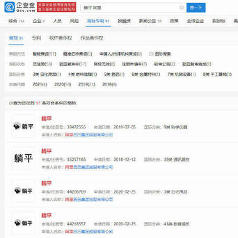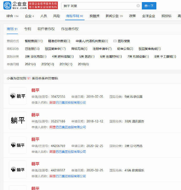 【阿里注册躺平商标】近日,躺平一词火爆网络,其实早在2018年12月阿里巴巴就曾注册躺平商标并开发相关应用。企查查APP显示,阿里巴巴目前共申请注册躺平商标91次,其中56个商标已注册,包含躺平、躺平设计家、躺大平。