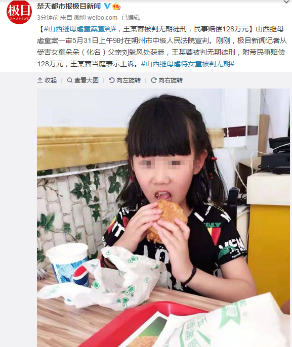 山西继母虐童案一审5月31日上午9时在朔州市中级人民法院宣判。刚刚,极目新闻记者从受害女童朵朵(化名)父亲刘魁风处获悉,王某蓉被判无期徒刑,附带民事赔偿128万元,王某蓉当庭表示上诉。