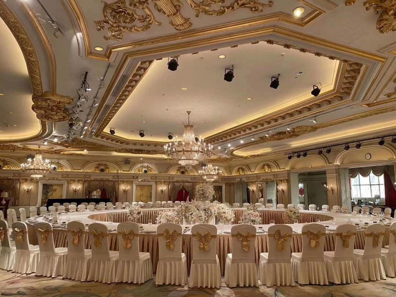 总店装修以简欧式风格为主,聘请著名设计大师,按照国际五星级饭店的水准进行设计装修。包房大小不一,均配备了独立洗手间和沙发休息区,装配了澳大利亚邦奇调光系统、美国专业音响设备,是您亲朋聚会、商务宴请的首选之地;宴会厅可同时容纳400人同时就餐,新西兰羊毛的手工地毯、36平米高清LED背投屏幕、金碧辉煌的婚宴主题装修风格,是亚洲十佳婚宴皇宫之一。