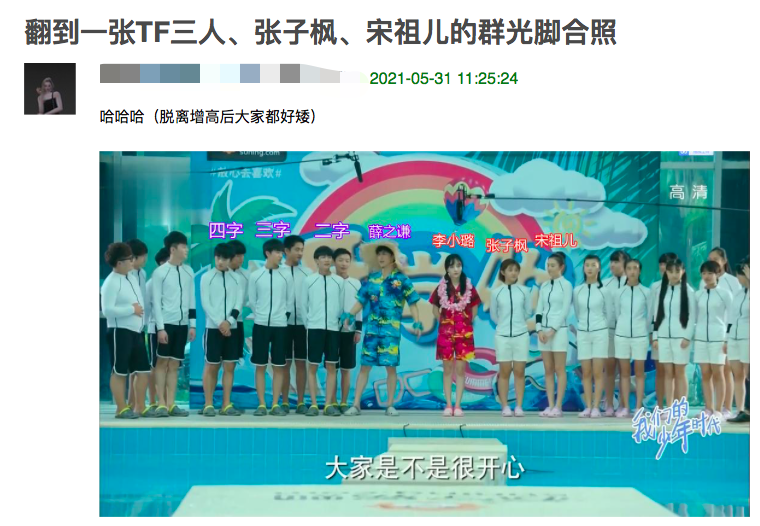还有网友翻到一张宋祖儿和张子枫、TFboys三人的合照,大概是四年前在《我们的少年时代》里,他们光着脚挺可爱的,就很青春的感觉。