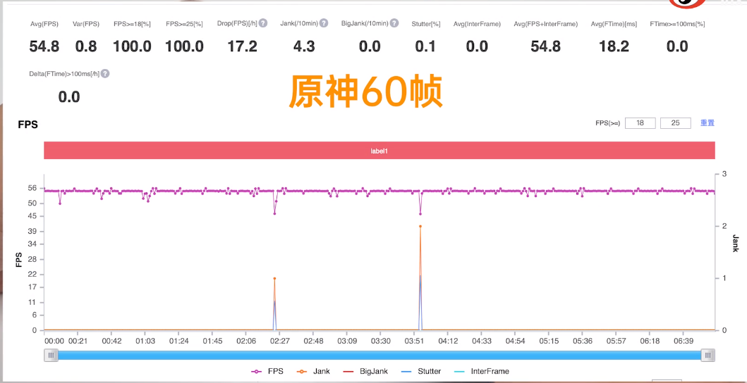 不只是闪电启动,数码大V@李杰灵 还全面测试了OPPO Reno6 Pro的游戏体验。首先是帧率表现,默认30帧流畅玩没问题,一到60帧的时候就开始有波动了,打斗一局下来,虽说平均帧率没有到顶,在54.8左右,但也没有太频繁的波动,较大的卡帧也只出现了一次,整体表现比较平稳。