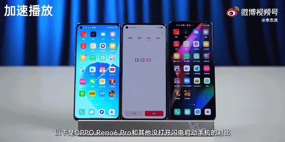 所谓的「超级闪电启动」指的是可以让用户更加快速地进入到游戏中,它可以根据系统的智能调度,在不增加功耗的情况下保证用户的每次启动基本都是热启动,当该功能设置好后,进入游戏仅需大约15秒左右,自动跳转游戏开头动画,体验快人一步。从下面数码博主@李杰灵 的实测中我们就能直观的看出,当OPPO Reno6 Pro已经进入游戏界面时,其他未开启闪电启动的机型才刚刚启动。