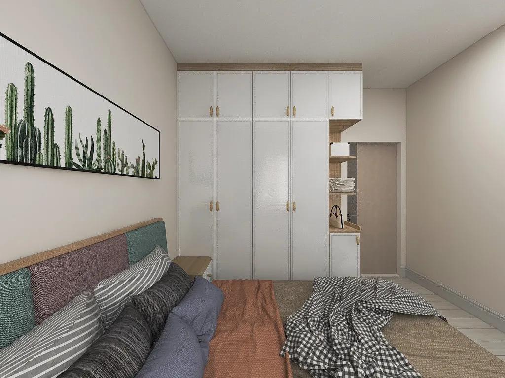 现代风格的卧室,原木色柜身+白色柜门的组合,可以很好地中和原木色的厚重感。衣柜进门处的拐角做开放区,可以挂衣服,随手收纳常用物品等。