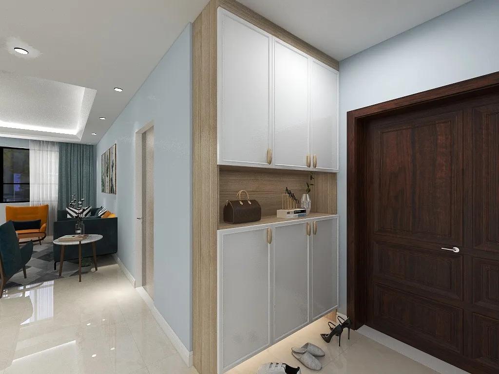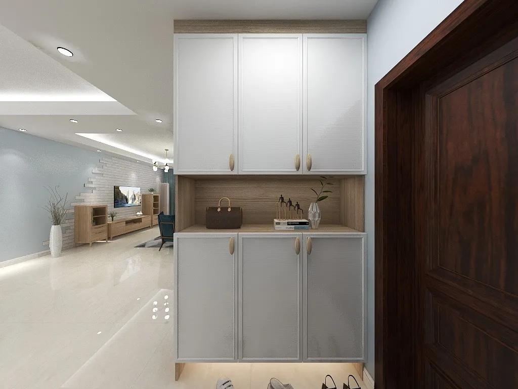 入户即是玄关,设计师选择了白色+原木色为基地,将门的右侧做对称式收纳柜,解决了储物问题,兼顾美观与实用。白色柜体的设计,让客厅风格显得干净明快,纯洁安宁。