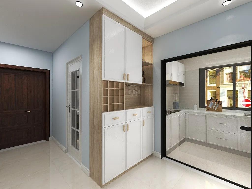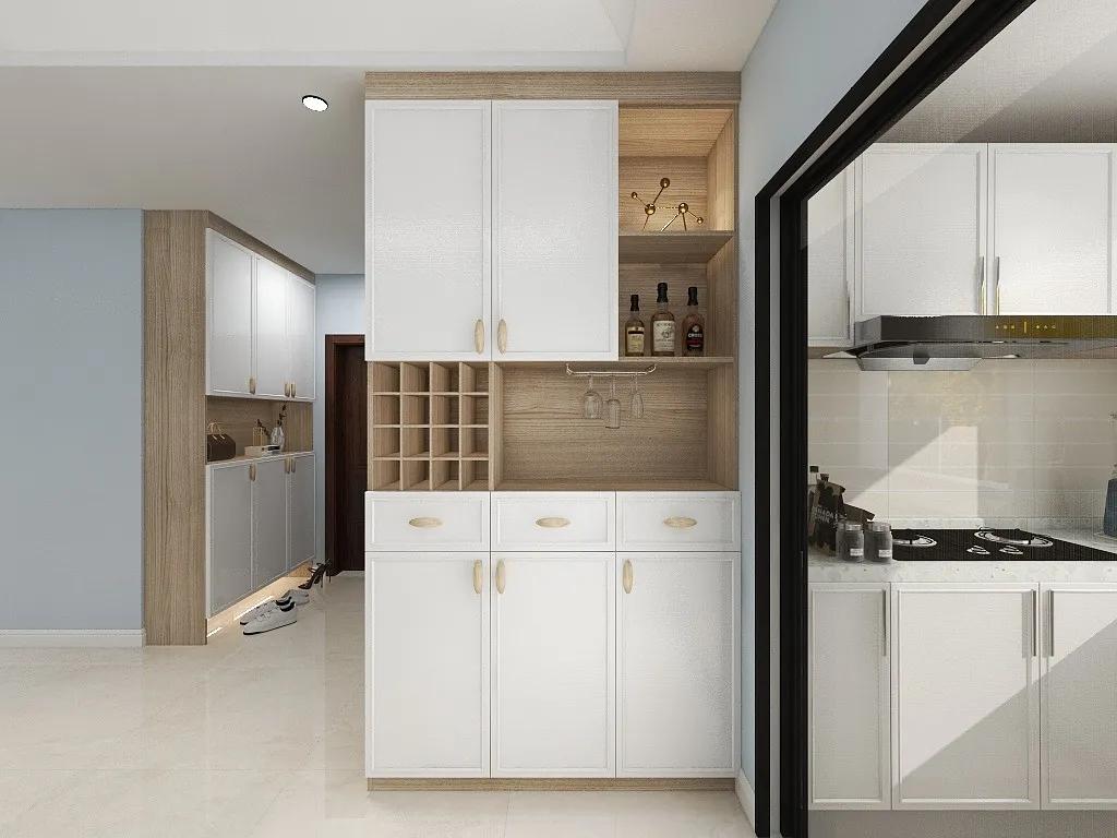 入户后的左侧,木色与白色的相互融入,简约轻松的意蕴,多功能收纳柜,还有酒柜以及收纳台等,整个柜子的收纳空间超大,而且颜值也高。收纳和展示相结合,定制柜完美利用整面墙的空间。