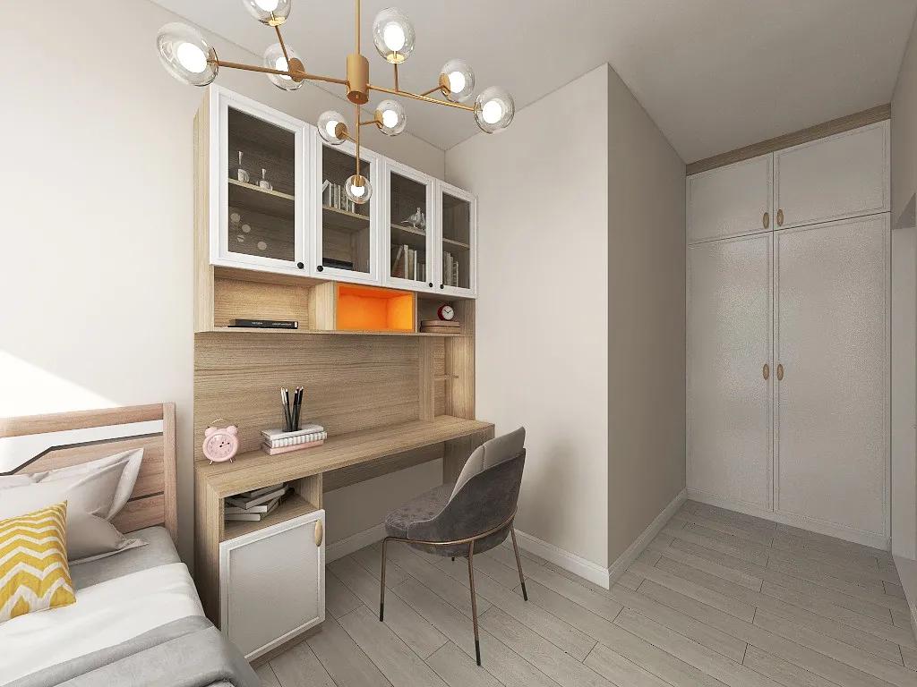 次卧房里面定制了很多柜子,床头旁边还一起定制了一张书桌,这里也可以学习区。书柜设计上下分离,上方主要是存放书籍,下方用于阅读,分配合理。书柜采用了玻璃柜门,方便查找书籍又美观大气。