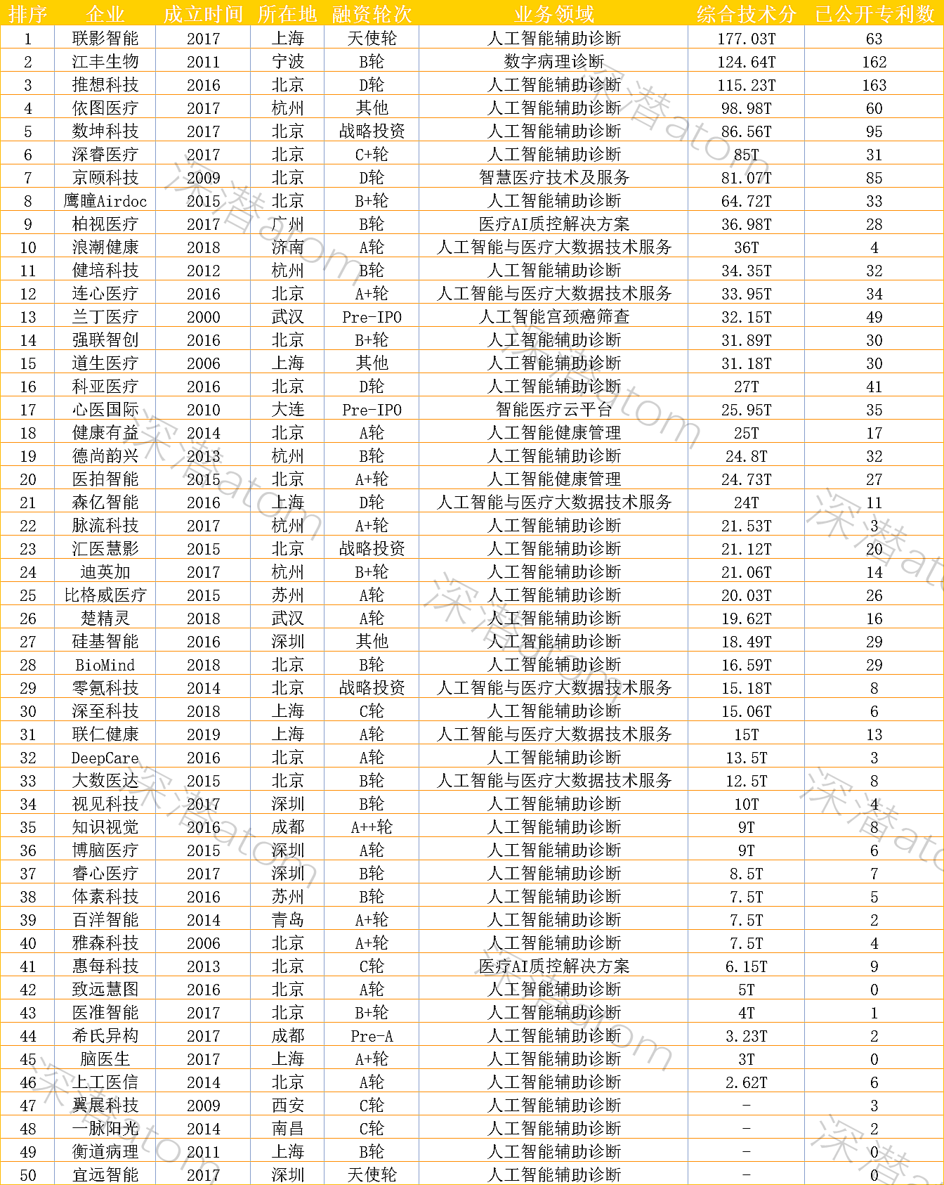 综合技术的发展对于医疗人工智能未来发展至关重要,深潜atom盘点了市面上比较有影响力的50家医疗人工智能企业,并且分析了他们各自已公开的专利情况。希望形成一些可供参考的维度和观点。