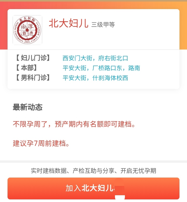 虽然目前北大妇儿不限制孕周了,但由于床位有限,建议孕妈们还是尽早建档,建议在孕7周内建档。
