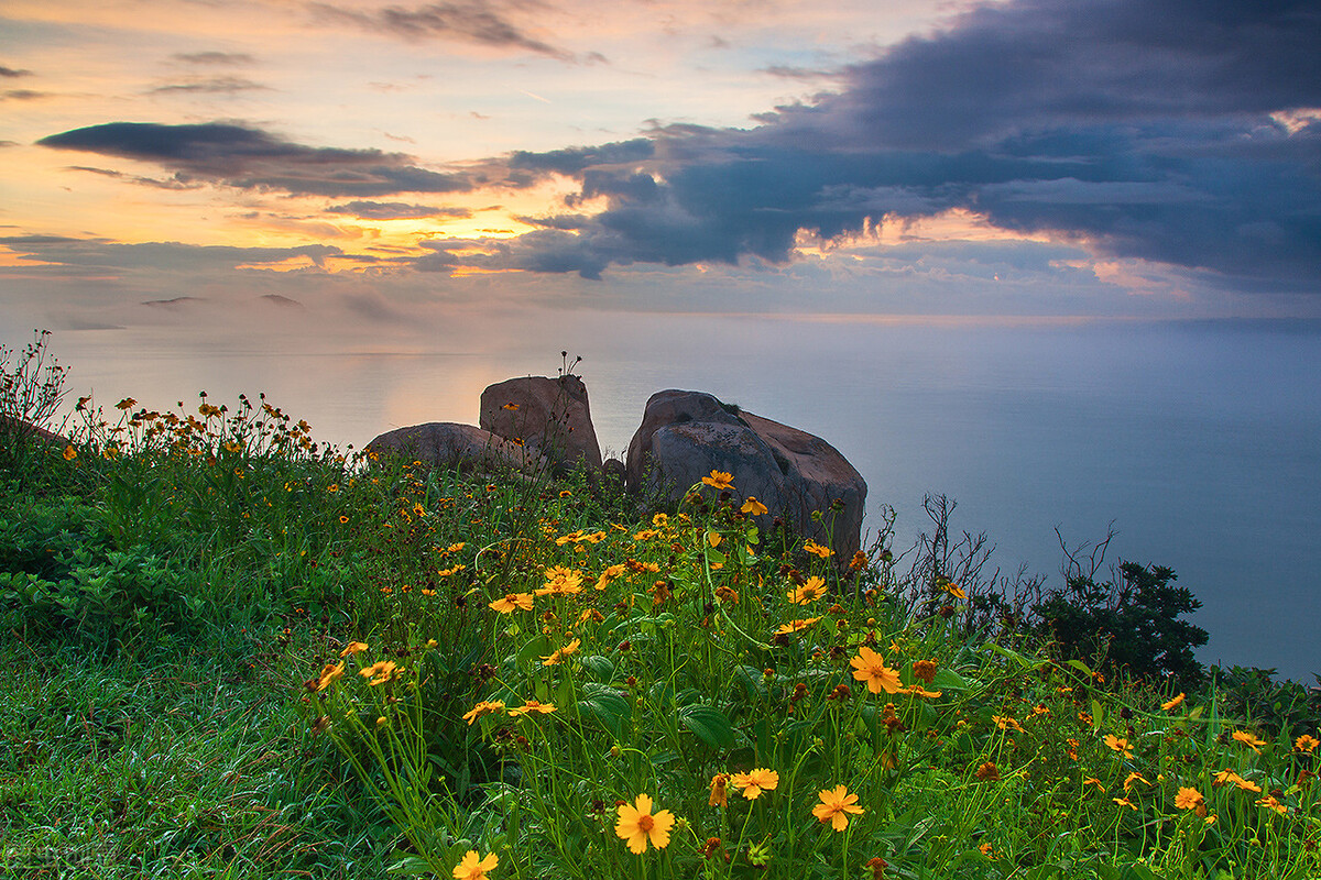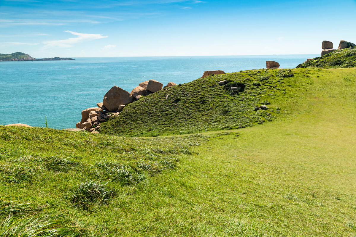三盘尾位于南麂岛的东南部,因形似飘在海面的三个盘子而得名,是南麂岛中观望海景的最佳观景处。由于三盘尾两峰之间都向中间倾斜,形成了一片五亩左右的大场地,上面有一片天然大草坪,平整光滑如地毯,是野餐的好去处。