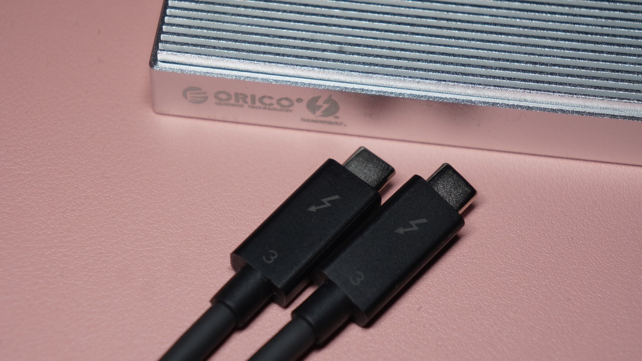 雷电3硬盘盒提供了一根C2C接口的雷电3数据线,为了让测试结果更具对比性,两个硬盘盒均采用了同一根雷电3数据线。
