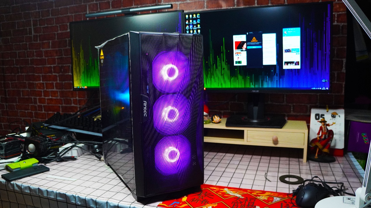 最后附上主机的硬件配置。机箱采用的是安钛克风行者 DF700 Flux,一款自带HUB、支持360水冷和自带五把风扇的中塔机箱,其中五把风扇里面包含了3个幻彩ARGB风扇、1个尾部风扇和1个反向风扇。自带的灯光与供电二合一的集线器,可以同时外接5个幻彩ARGB风扇,还可以直接连接主板实现灯光同步。前顶支持双360水冷,前方同时支持三明治水冷安装。拆装上比较方便,在内部的空间容量可以满足容纳下当前绝大部分显卡、电源、风冷等,开孔数量和位置上可以满足日常走线的需求。