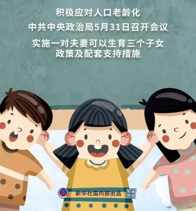 中共中央政治局5月31日召开的会议指出,进一步优化生育政策,实施一对夫妻可以生育三个子女政策及配套支持措施,有利于改善我国人口结构、落实积极应对人口老龄化国家战略、保持我国人力资源禀赋优势。要完善生育休假与生育保险制度,加强税收、住房等支持政策,保障女性就业合法权益。对全面两孩政策调整前的独生子女家庭和农村计划生育双女家庭,要继续实行现行各项奖励扶助制度和优惠政策。