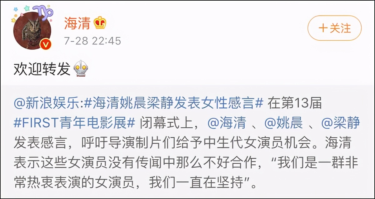 譬如在某颁奖典礼上,海清发言说娱乐圈对中年女演员给的机会太少,呼吁外界应该重视中年女演员。