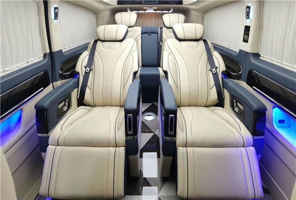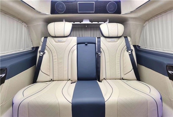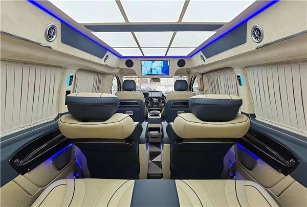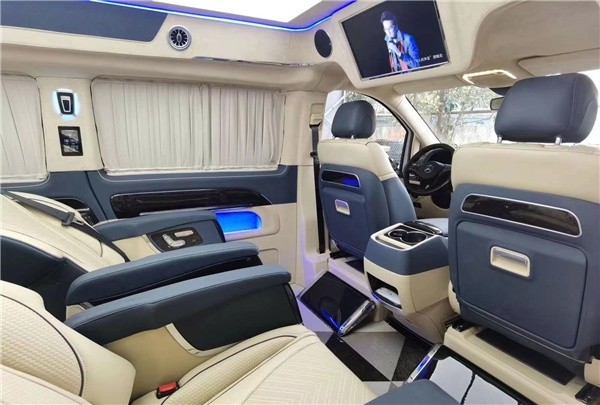 后舱部分,整个全部的座椅更换为豪华的航空座椅,带有按摩,通风、加热功能。包括整个后舱的一个隔音处理。仿羚羊纹真皮地板,高顶版的顶部灯光设计,搭配两侧壁柱灯,更显出这款车的独一无二。