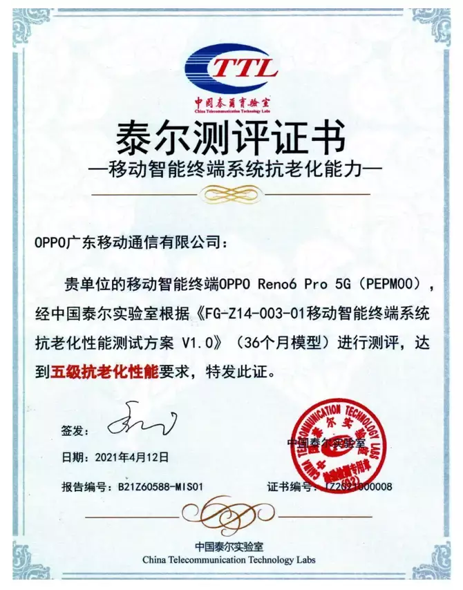 正是得益于此,OPPO Reno6系列通过了泰尔实验室五级抗老化认证,可以做到保证36个月流畅不卡顿。系统会智能识别前台应用,保证负载场景下前台响应效率和流畅性,还会优化全场景的触控体验。当手机发生异常情况时,手机还能进行系统守护,保证系统的稳定运行。此外,通过AI学习用户的使用习惯,在设备休眠时进行系统优化,缓解系统老化。总体来说,OPPO Reno6系列会全链路、全周期地进行系统进行优化,为用户带来持久的流畅体验。