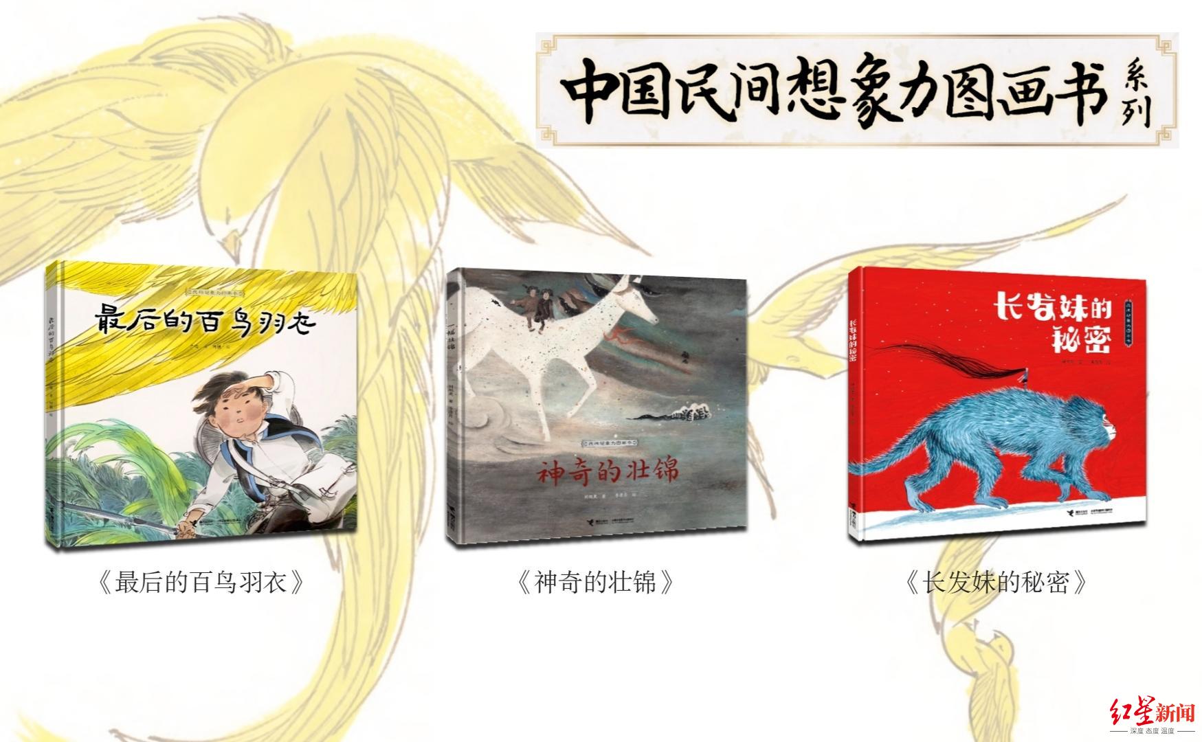 “中国民间想象力图画书”系列是一套为现代孩子创作的中国民间文学图画书。2021年3月出版《最后的百鸟羽衣》《长发妹的秘密》《神奇的壮锦》3册,分别取材于经典民间故事“百鸟衣” (苗族/壮族)、“一幅壮锦”(壮族)、“长发妹” (侗族)。