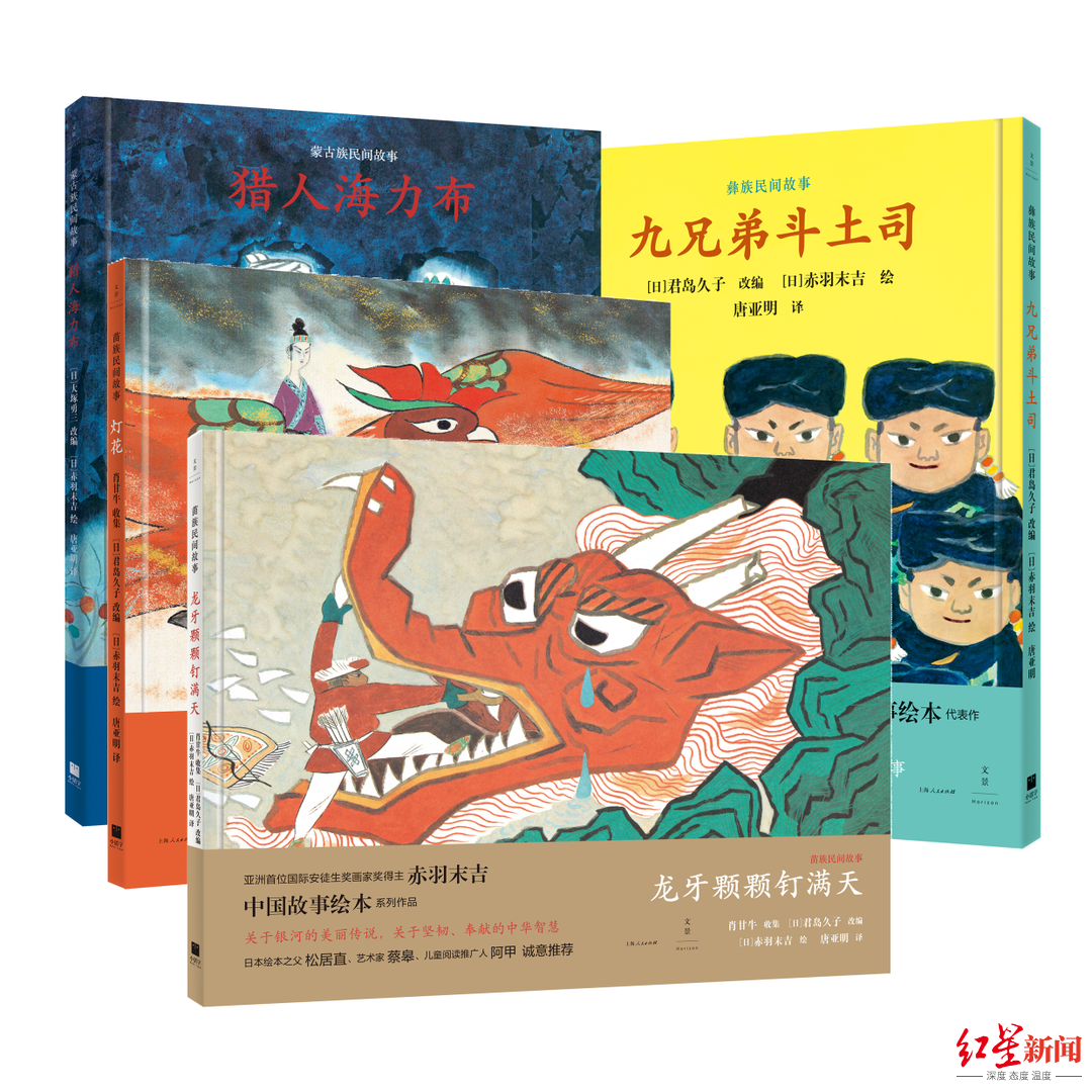 同样是取材于中国经典民间故事,还有一套经典童书,“赤羽末吉中国故事绘本”系列(全4册)包含了《灯花》《猎人海力布》《龙牙颗颗钉满天》和《九兄弟斗土司》。