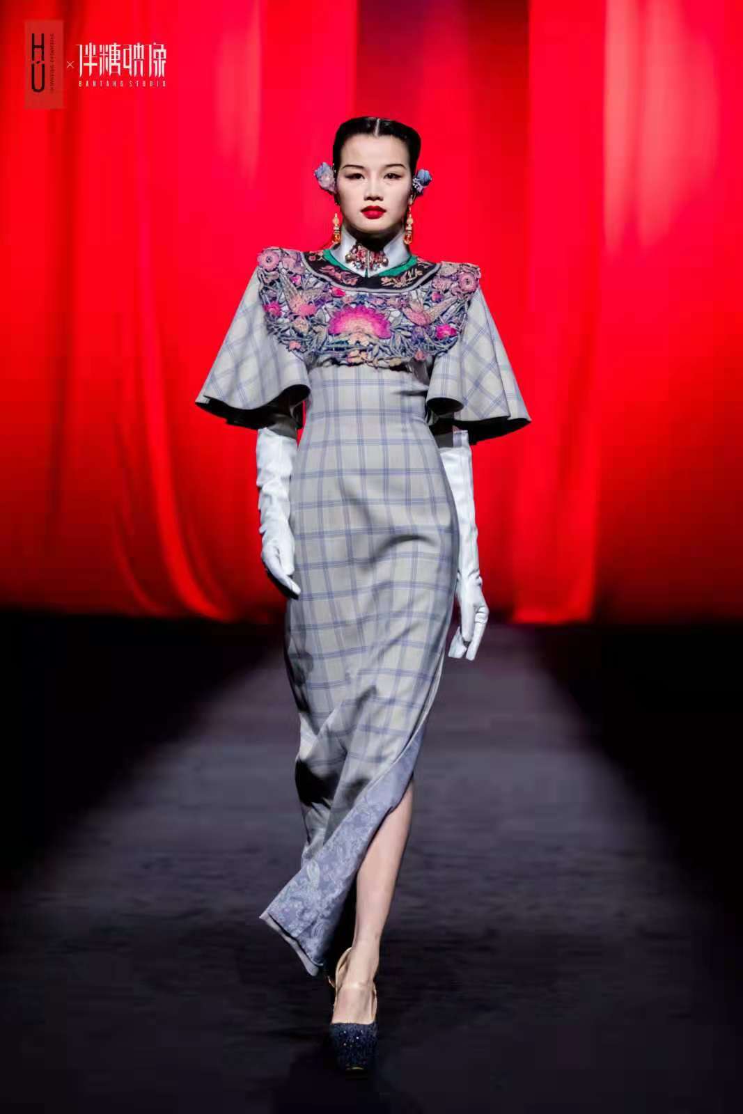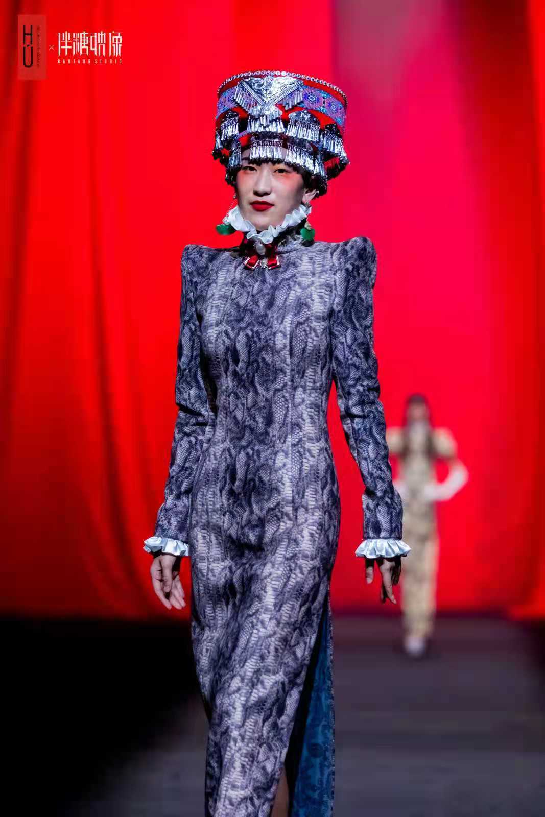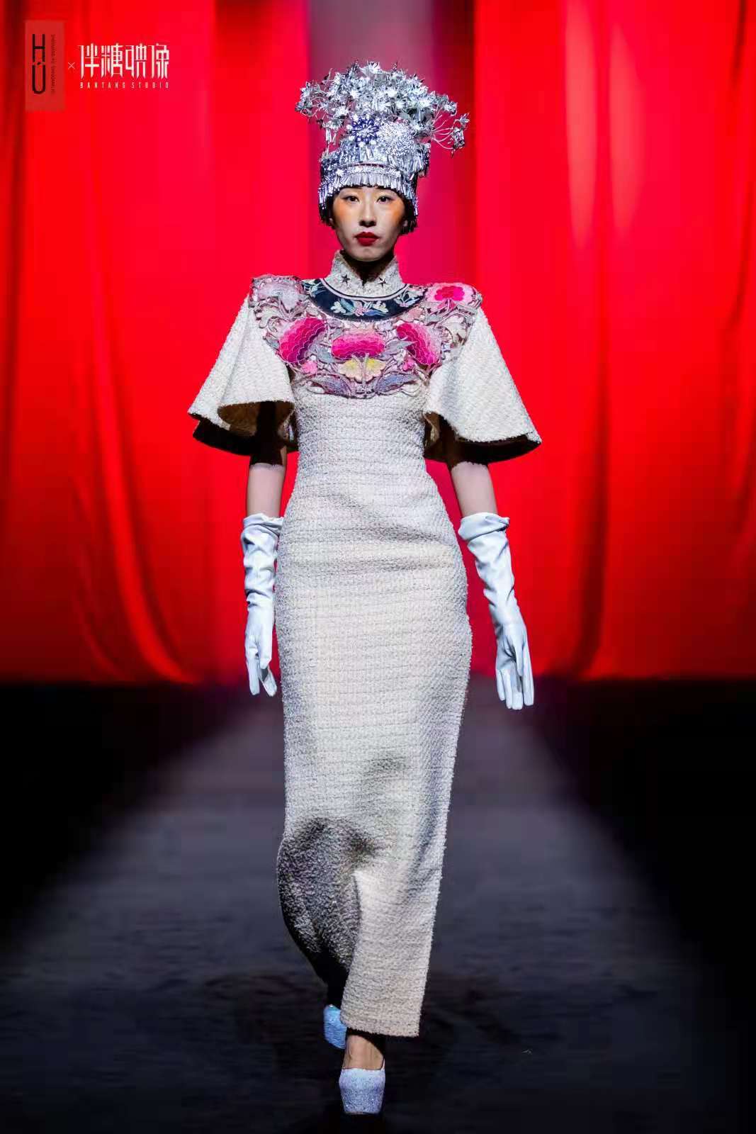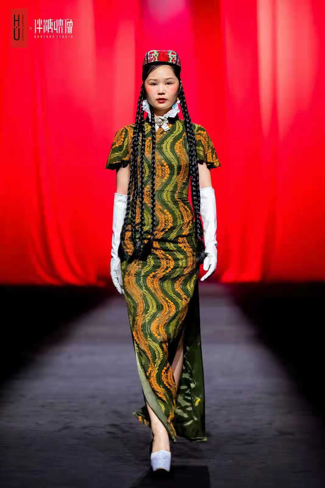 著名设计师胡社光最擅长将中国文化和历史演变为时尚语言,此次旗袍设计采用极具民族特色的俏肩设计,廓型上结合立体裁剪和中式留白,为旗袍赋予恢弘壮阔、策马飞扬的动态美,将唯美浪漫的风格赋予旗袍的曲线中。旗袍与56民族帽饰结合,这是前所未有的一种配饰方式,为大秀赋予更丰富的层次,书写了国家和民族发展的壮丽史诗,向世界展现东方大国的深厚底蕴。在纹样中,采用中国传统非物质文化遗产中的经典元素,取材中国自然风光,一丝不苟的精致刺绣围绕周身,京绣、苗绣、苏绣、珠绣、提花等工艺,犹如一本中国文化“活字典”,展现中国态度、匠人匠心。采用雪纺、真丝、仿皮草、竹纤维等面料,经典也当下,时髦也入时。桃夭、秋香、凝脂、天缥、紫苑、月白……这些颜色取自自然、诗情画意,犹如彩虹般绚丽,这是旗袍颜色的感官意境。此次旗袍设计,在整体上呈现出和谐之美。
