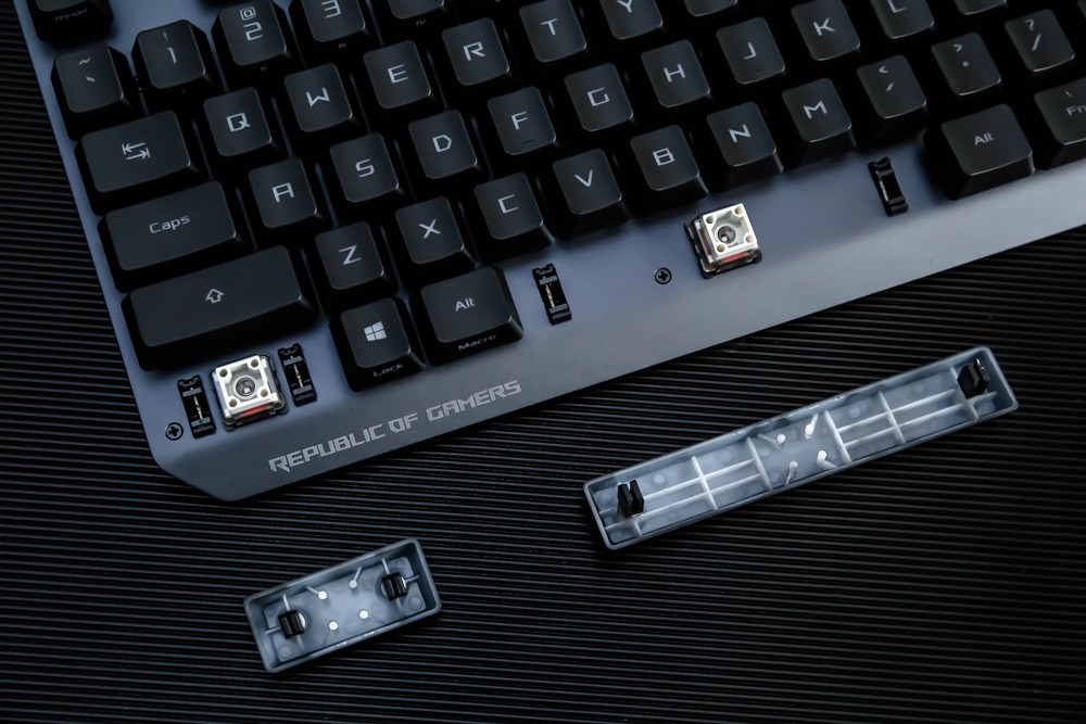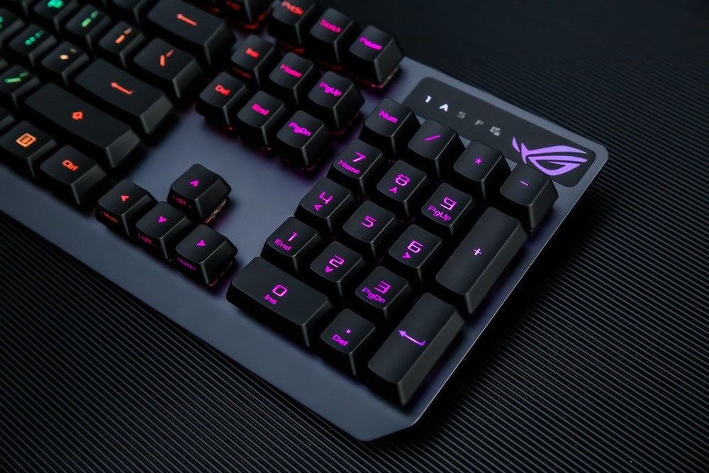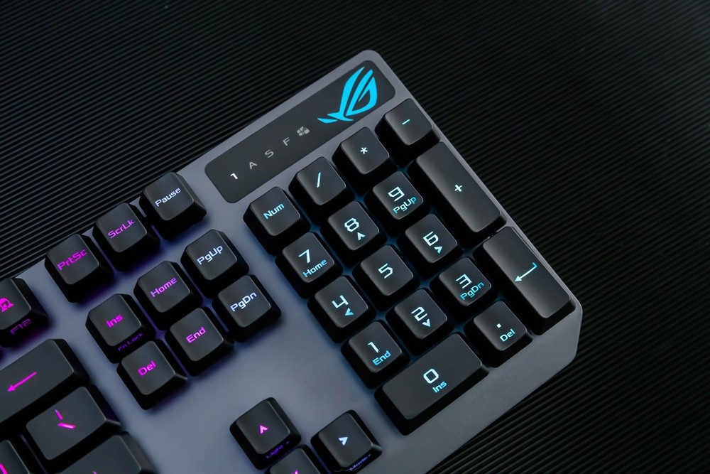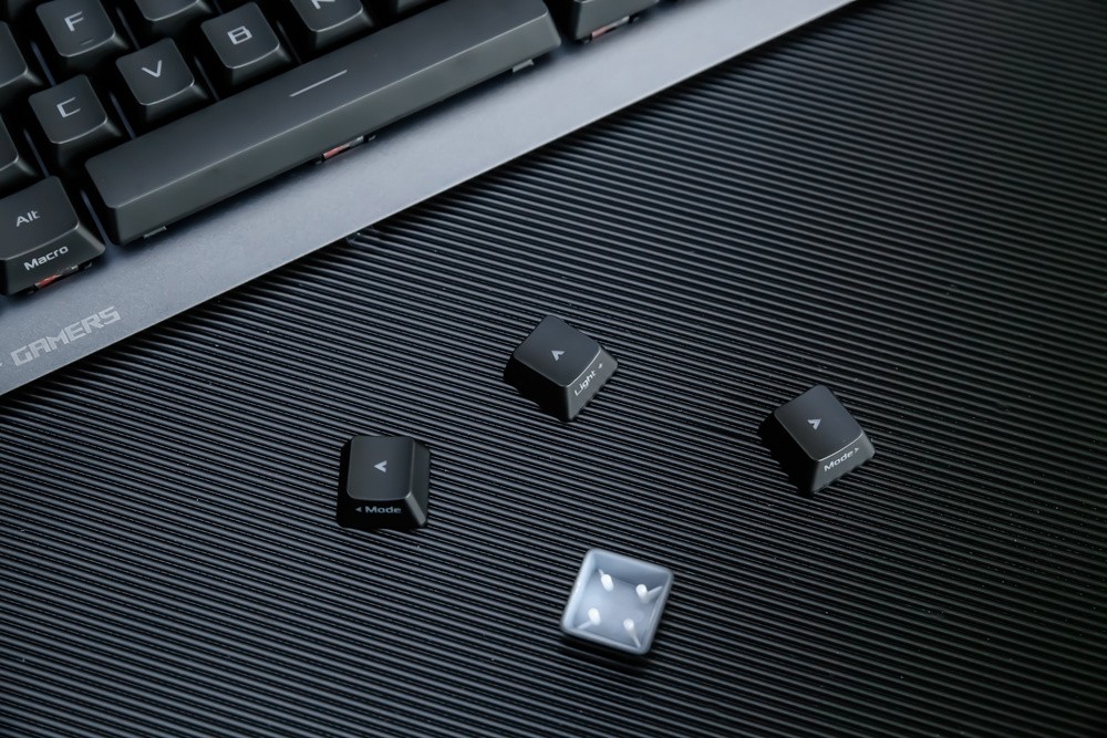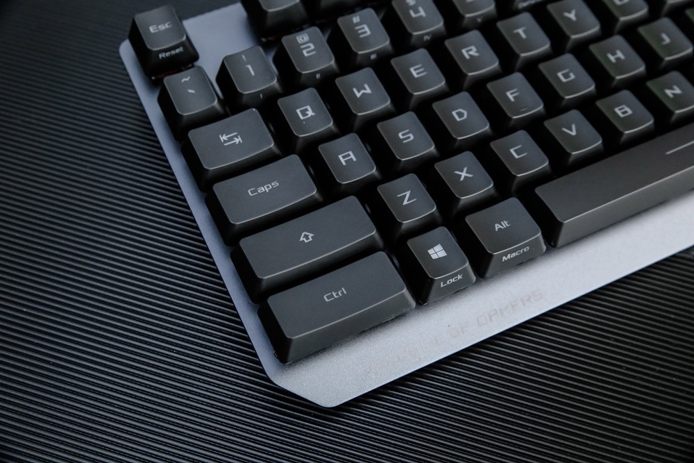 键帽方面,此次ROG游侠RX游戏键盘不无意外的采用了主流的ABS材质,双色注塑工艺的透光涂层键帽,字母印刷清晰通透,且部分键帽还采用了正刻+侧刻的混合模式,而其类肤涂层令触感细腻舒适,不过长时间使用的话,还是有打油的可能,倒是期待ROG后续能提供PBT键帽的按需选择。