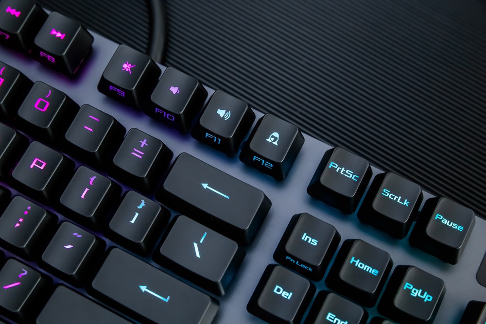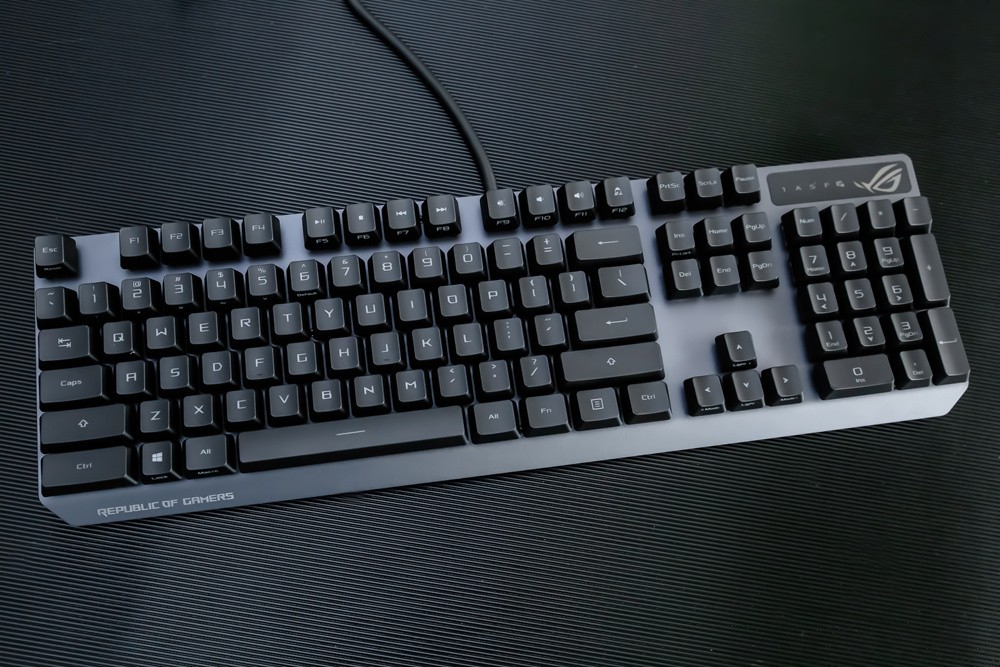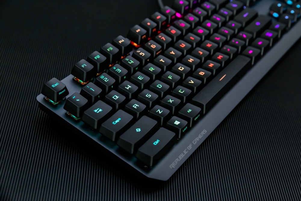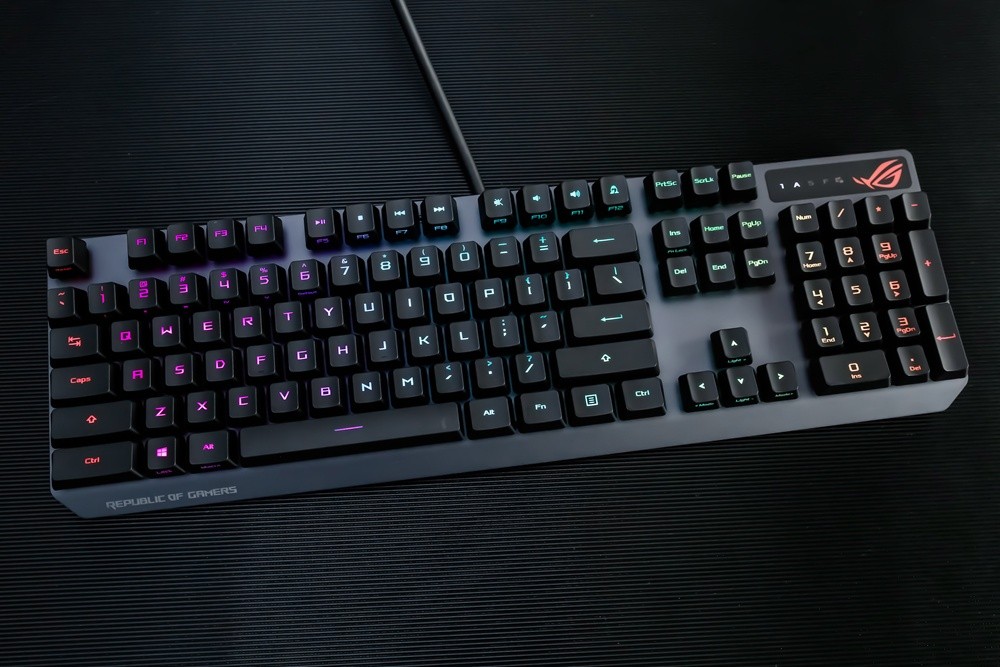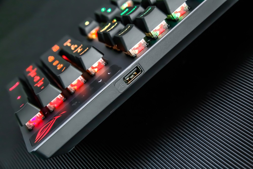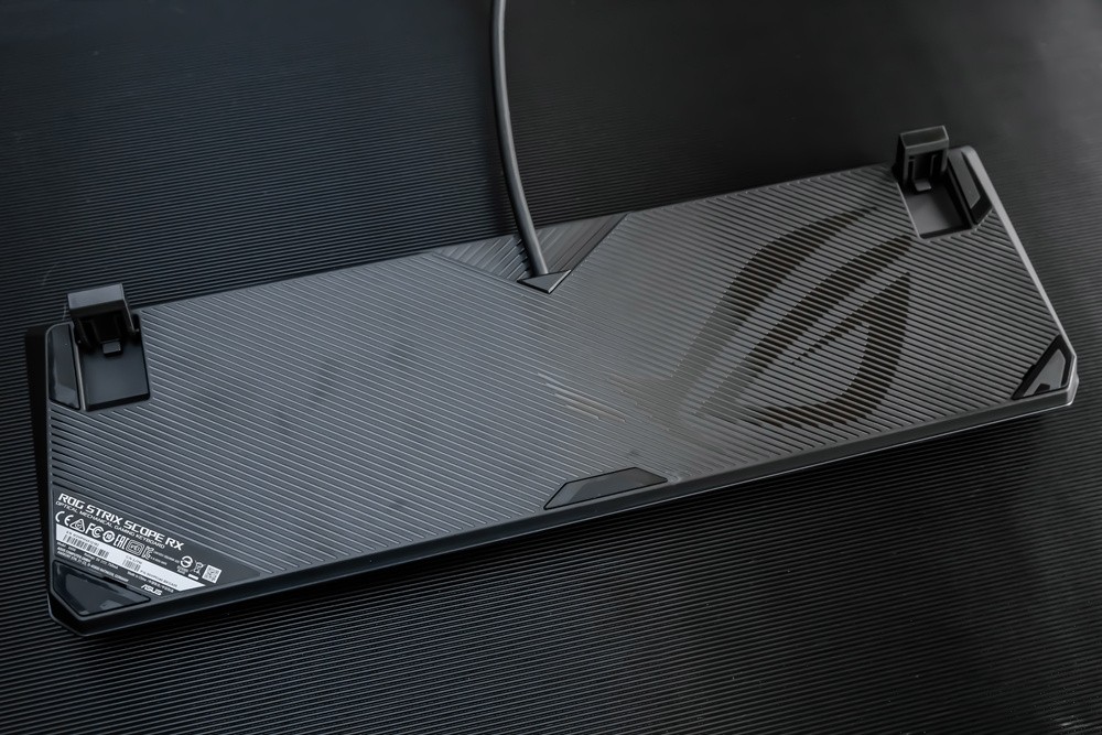 键帽方面,此次ROG游侠RX游戏键盘不无意外的采用了主流的ABS材质,双色注塑工艺的透光涂层键帽,字母印刷清晰通透,且部分键帽还采用了正刻+侧刻的混合模式,而其类肤涂层令触感细腻舒适,不过长时间使用的话,还是有打油的可能,倒是期待ROG后续能提供PBT键帽的按需选择。