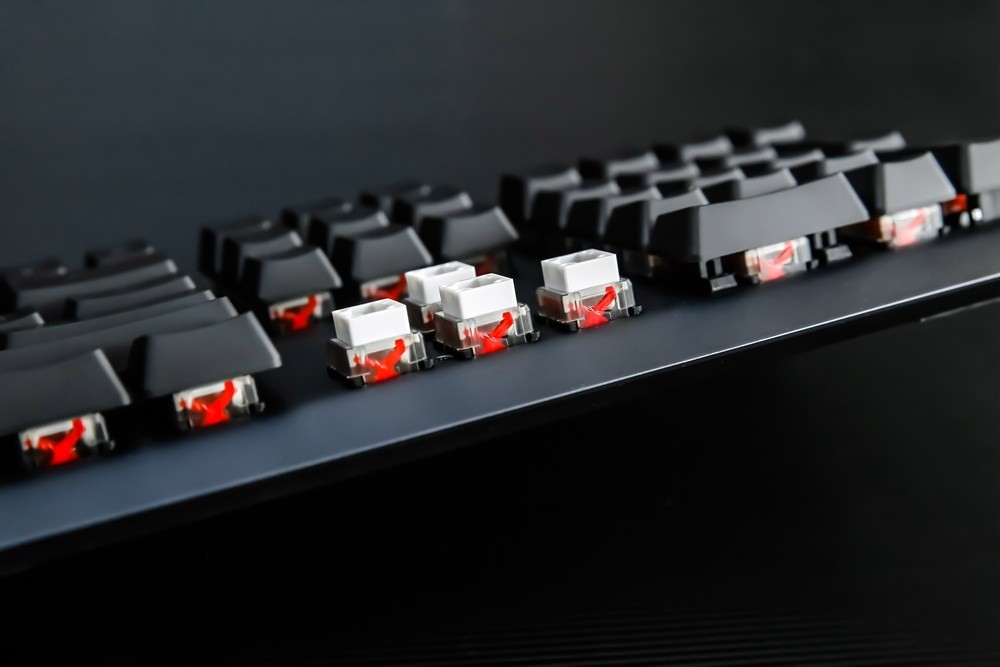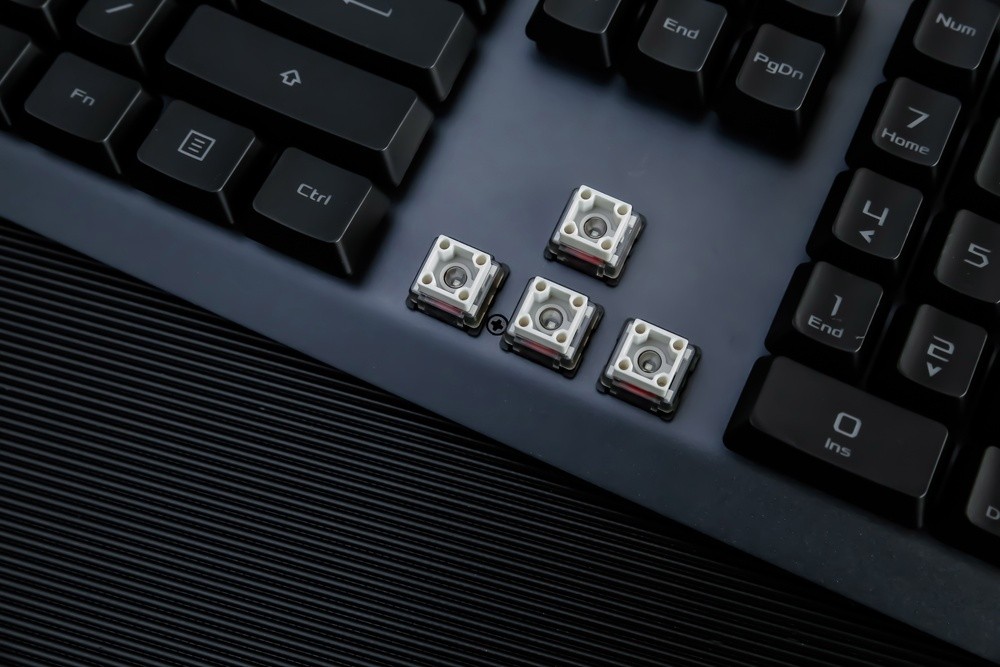 作为这款键盘最大特色卖点的轴体,自然是需要重点和大家分享一下,毕竟这是ROG首把搭载自研光轴的键盘。首先是结构,ROG的光轴采用了更大受力面的方形火山口设计,并在四角加入了固定插栓,与此同时还在轴体内部还加入了红色剪刀状的X结构稳定模块,可谓三管齐下的充分确保了按压键帽的任何区域都不会出现晃动或是不一致的压力偏差,相较目前市面上主流的十字轴键轴设计,可谓是非常大胆突破的一次创新,真的是只有上手体验过才会知道这般设计的精妙。