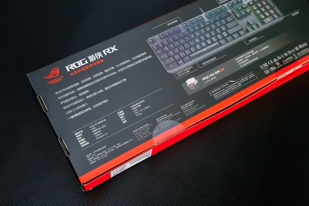 首先,包装风格还是大家非常熟悉的ROG外设家族特色,无论是炫酷的霓虹“败家之眼”LOGO装饰底纹,还是键盘写真上的标识以及盒子左上角的LOGO,单单一个正面就给足了品牌亮相,简直能满足信仰粉的小心思。当然,这把键盘的特色卖点自然是不可或缺的进行了标识,包括采用线性&快速的光学红轴,支持IP56级防水防尘,以及支持Aura Sync“神光同步”灯效等。而包装盒背面则将键盘的参数、卖点和一些细节设计阐述得更为细致,这里就不展开累述了。