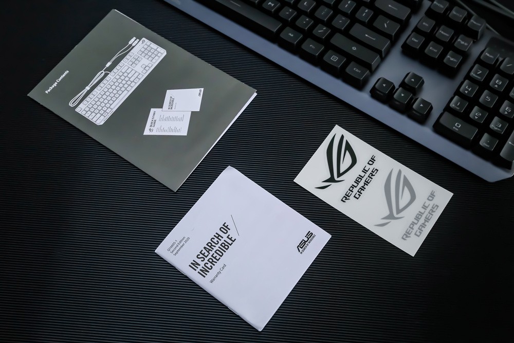 回到主角ROG游侠RX游戏键盘,其无边框+悬浮式键帽的紧凑外观设计与去年发布的家族游侠键盘无出其右,一样的440 * 137 * 39mm三维尺寸,相同的104全键无冲设计,但重量方面估计是换成了光轴的缘故,较之前采用樱桃轴的游侠键盘要重一些,达到了1400g。当然,值得肯定的是,其保留了喷砂工艺的航空级铝合金面板加持,除了保持放置稳定手感的同时,自然是更加的坚实耐用。