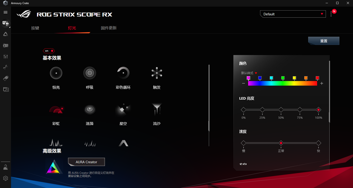 作为一款免驱的键盘尽管可以即插即用,但要更好的体验到丰富功能,以及想实现神光同步,还是需要安装大家所熟悉的专属管理软件ROG Armoury Crate。在设备页面提供了按键自定义与宏功能、RGB灯效设定以及固件升级等设置项。同时,如果拥有多款支持RGB的ROG设备的话,自然得用上AURA SYNC 神光同步,充分满足个性化的炫酷光污染需求。最后还是照例来几张灯效展示: