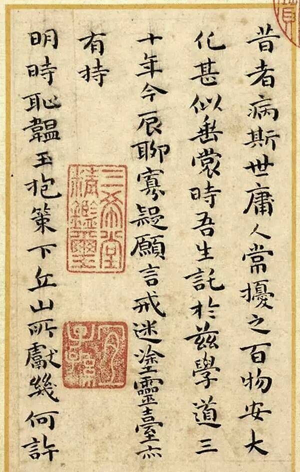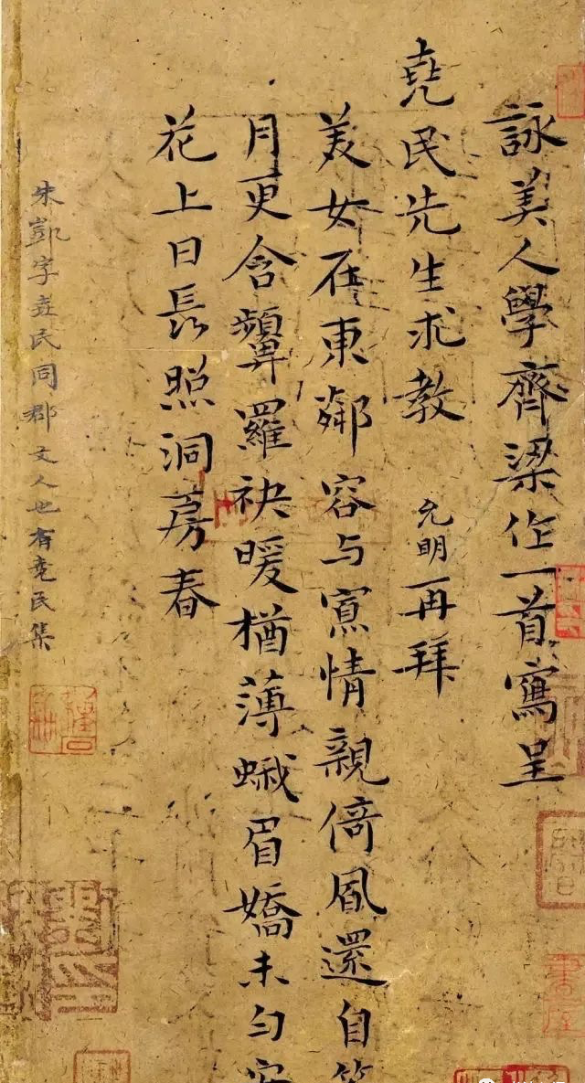 此卷为祝允明《录刘姬词及致朱凯札》,现藏上海博物馆,是装裱在一起的两件作品,难得的是,两者都是小楷,但体貌不同,都是祝允明小楷精品之作。 钟繇名迹《荐季直表》 曾在苏州地区流传,直接影响该地区的钟体流行,祝允明约三十岁时跋此墨跡。