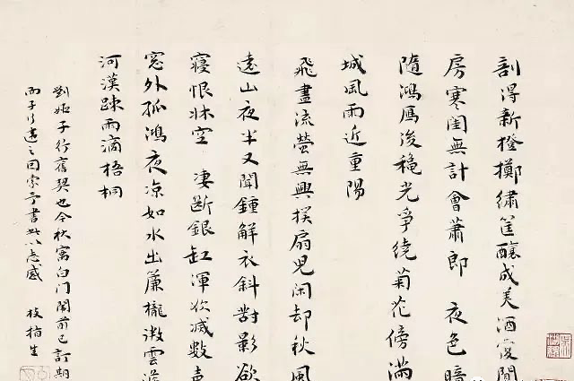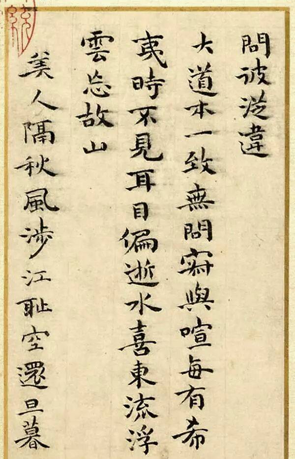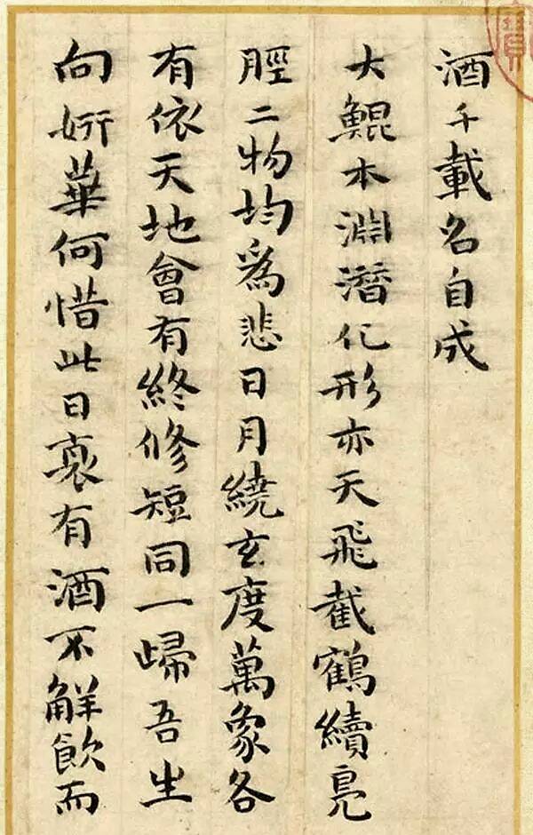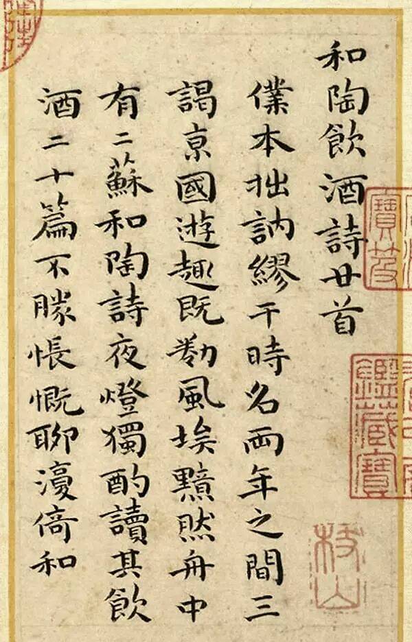 祝允明小楷《和陶饮酒诗廿首》作于四十岁,为祝允明得意之作,故多次抄写,此册写于六十六岁。小楷结构宽扁,点画圆润,行笔短促,渊源于钟繇楷体,反映出他对钟繇小楷的理解与诠释。