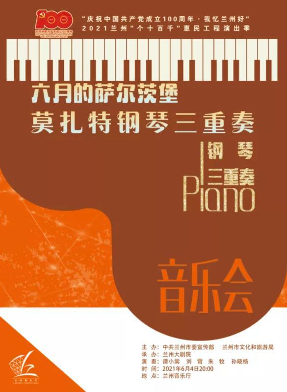 由兰州市委宣传部、兰州市文化和旅游局主办,兰州大剧院承办的“庆祝中国共产党成立100周年·我忆兰州好”2021兰州“个十百千”惠民工程演出季——《六月的萨尔茨堡》莫扎特钢琴三重奏音乐会,将于6月4日晚8时在兰州音乐厅奏响。主办方通过掌上兰州·兰州晨报送出免费入场券,邀请市民群众共享文化盛宴。中奖者每人可获得2张入场券(共20张)。