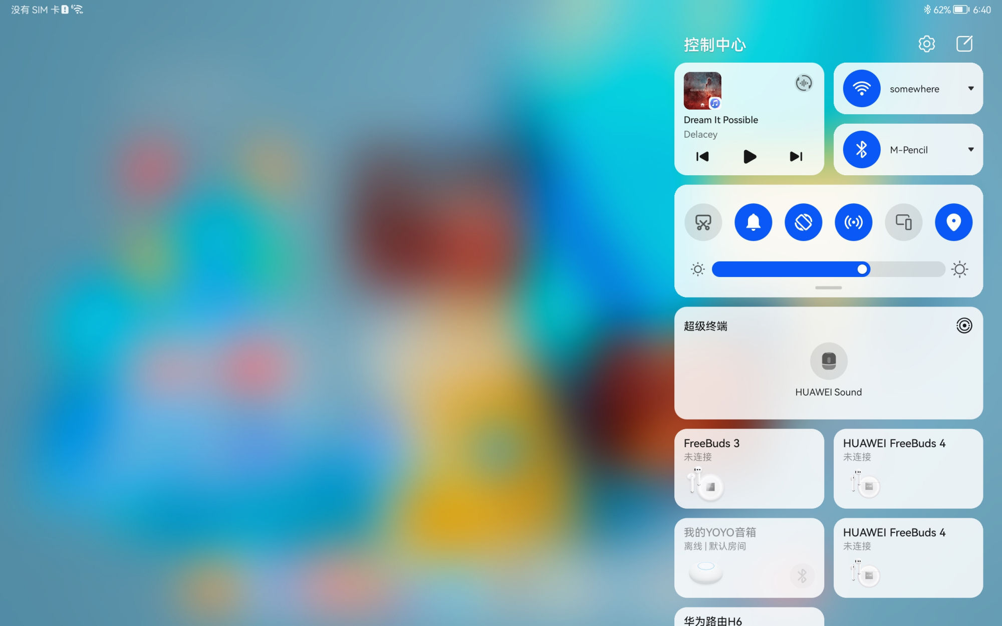 除此之外,华为MatePad Pro 12.6英寸通知页面和操控中心也进行了分开:左上角下拉调出通知页面、右上角下拉调出控制中心。从上图也能看到:控制中心除了原来的Wi-Fi、蓝牙等常规开关按钮,同时也新增了音频播控中心、超级终端等系列模块。