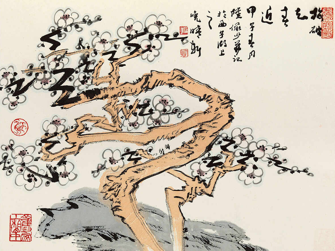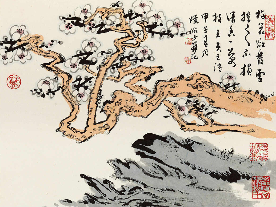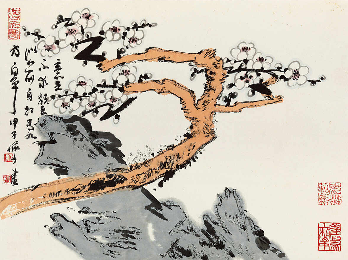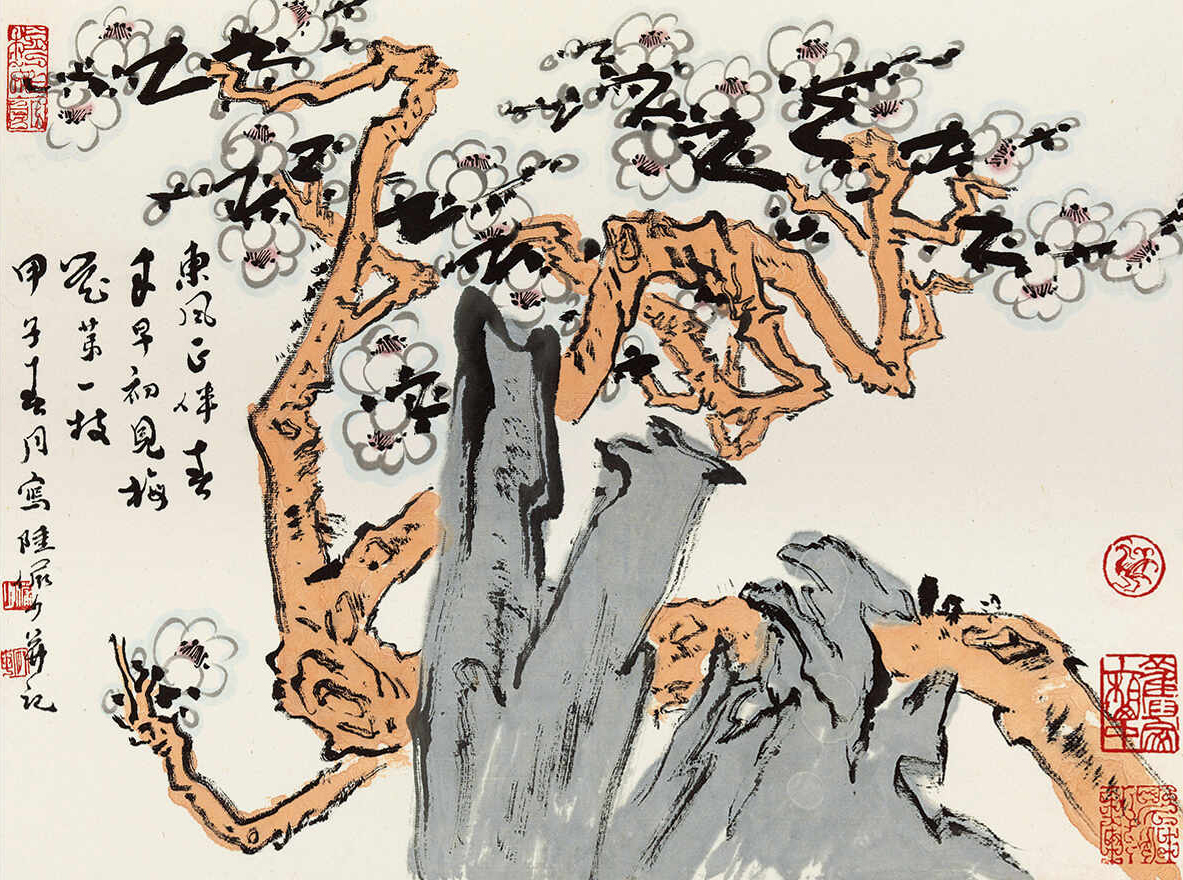 题识:东风正伴春来早,初见梅花第一枝。甲子春月写,陆俨少并记。