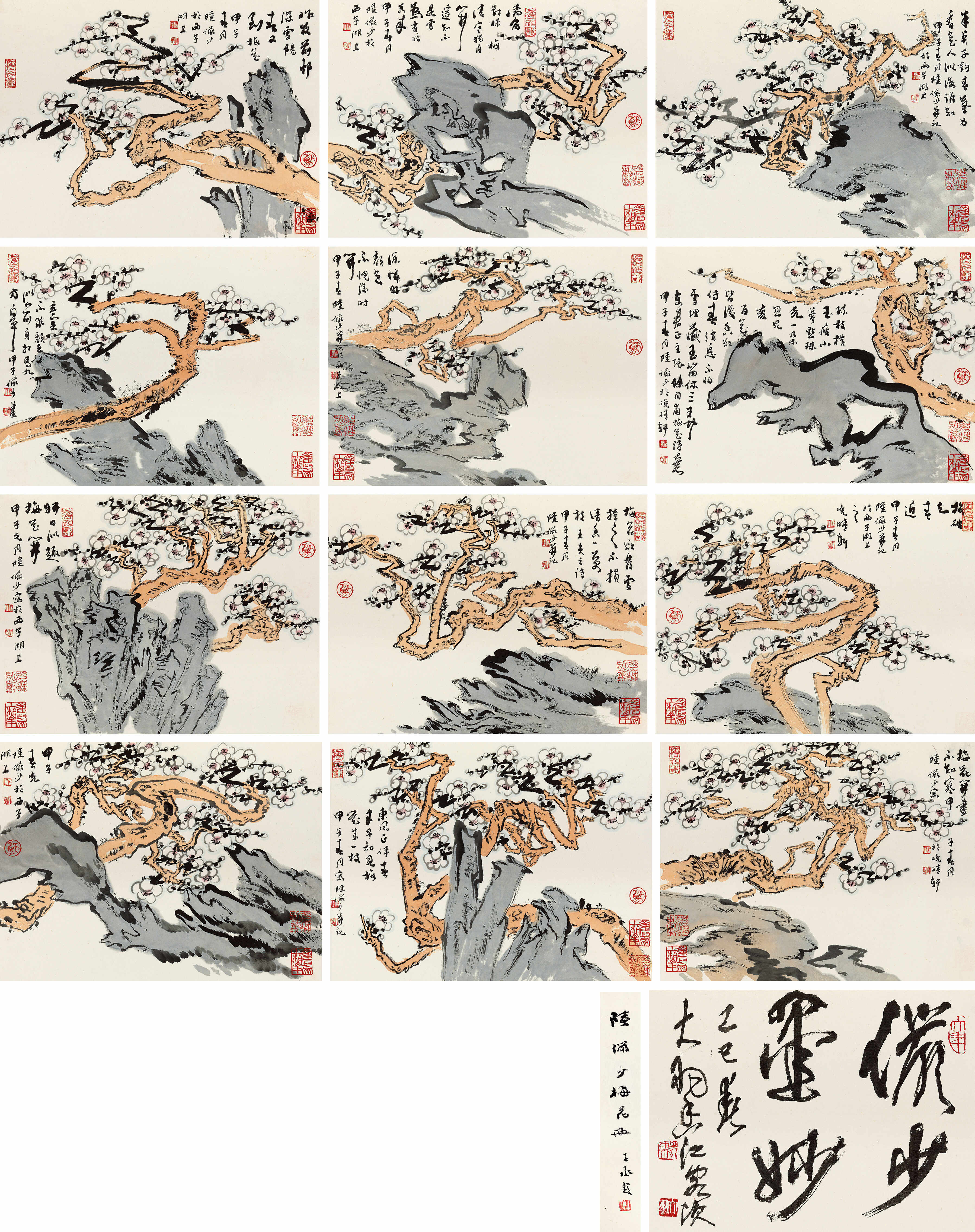 《梅花册》由画家陆俨少1984年作,设色纸本,总计十二幅,每幅作品尺寸纵34厘米,横45.5厘米,约1.4平尺。
