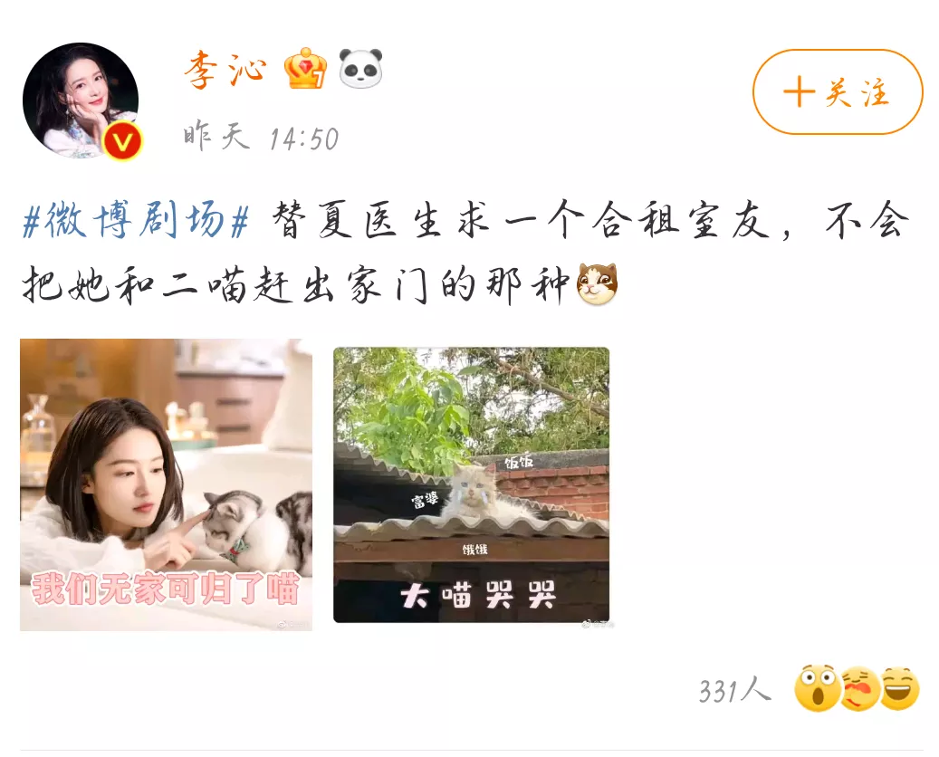 开播前,李沁发微博在线为夏医生求一个合租室友,还说要——“不会把她和二喵赶出家门的那种”,为新剧做宣传。