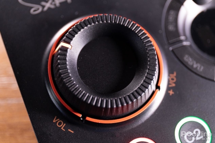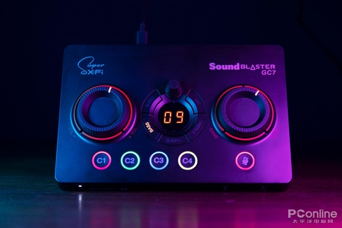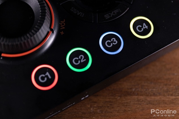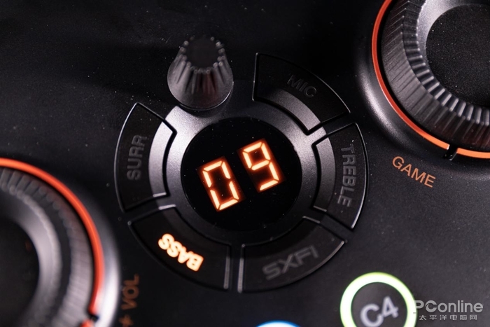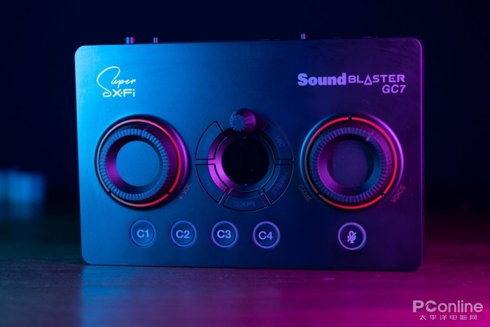 GC7的操作逻辑也十分简单,左右两侧的旋钮分别是控制音量和GameVoice Mix(游戏人声混音器)。中间的按键部分则是声效按键,可以根据需要切换自己想要的声效,包括常用的环绕声、MIC、BASS增益以及创新自家备受好评的SXFI音效。