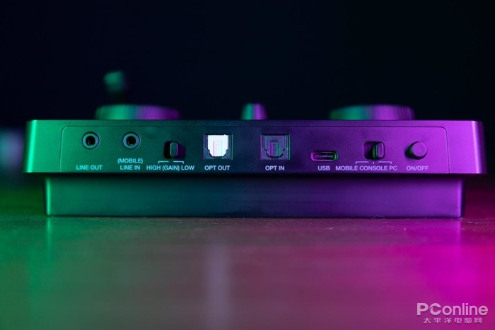 机身背面从左到右分别是3.5mm的线性输出、输入接口,增益调节键,光纤输出、输入接口,USB-C接口,模式切换键,以及电源按键。