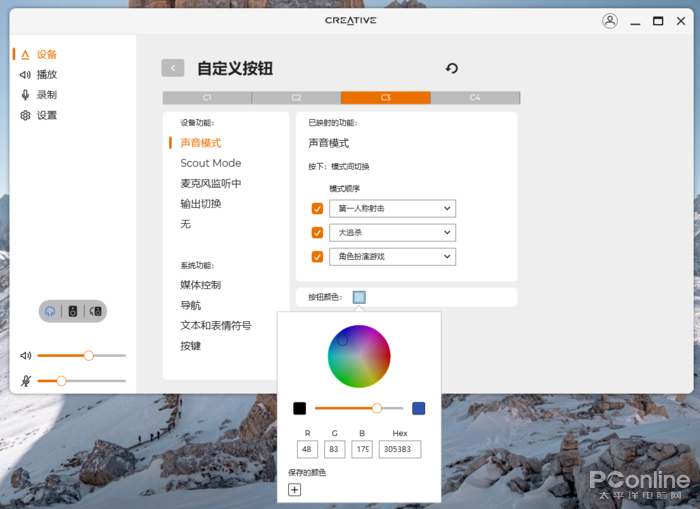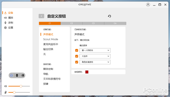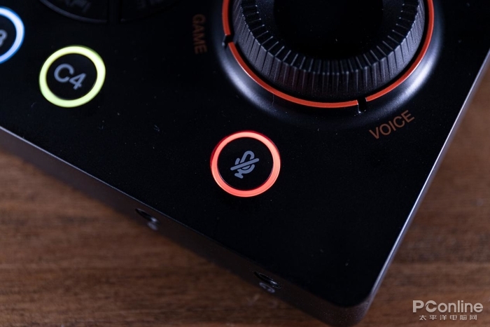 底部则是4枚自定义按键,可以根据自己的习惯进行调整。混音器旋钮下方有一枚静音键,可以一键静音,十分方便。