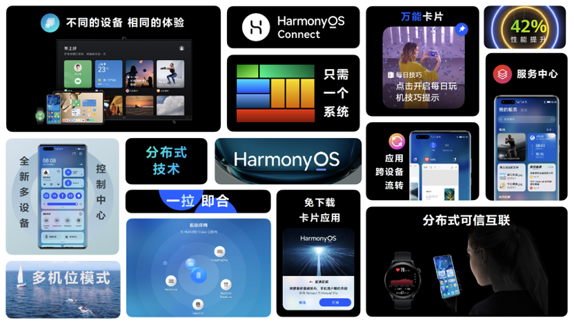 发布上展示了HarmonyOS 2全新的系统架构、革命性的分布式技术、全新的原子化服务、全新的卡片设计、极致的系统性能。此外,华为Mate 40系列、Mate 30系列、P40系列、Mate X2、nova 8系列等近百款设备将陆续升级HarmonyOS 2。